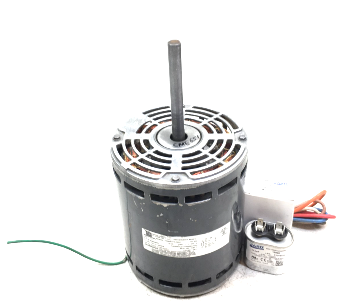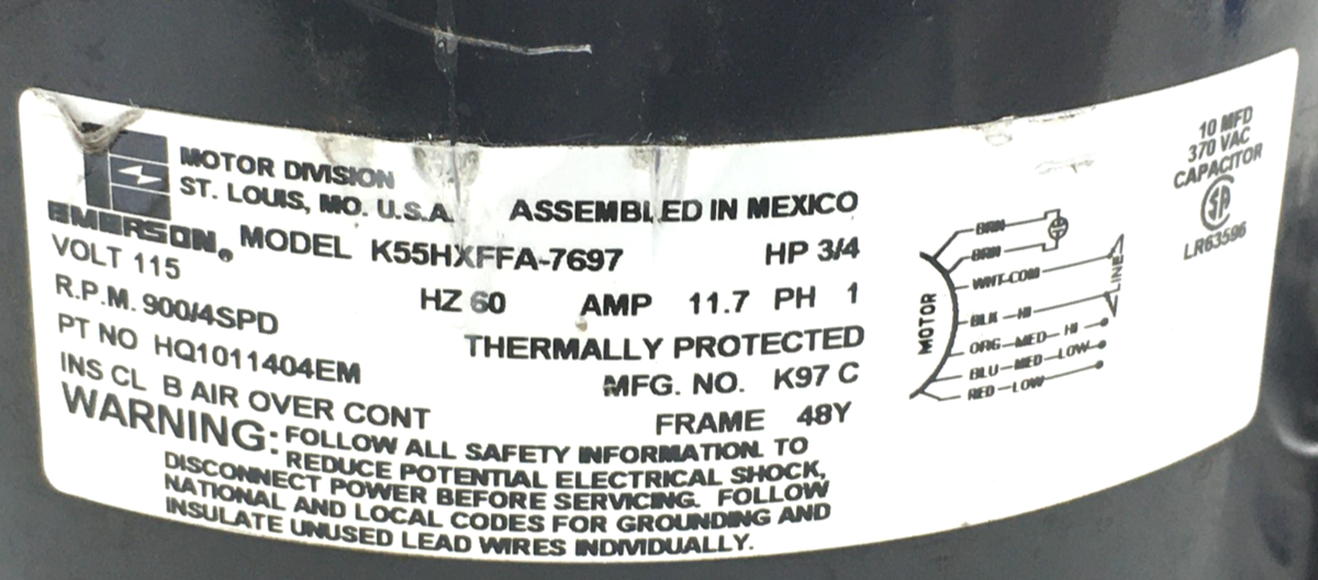 This is Emerson K55HXFFA-7697 Blower Motor 115V RPM 900/4 SPD 3/4 HP HQ1011404EM used part, comes with a brand new capacitor.