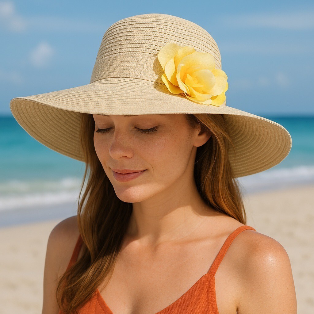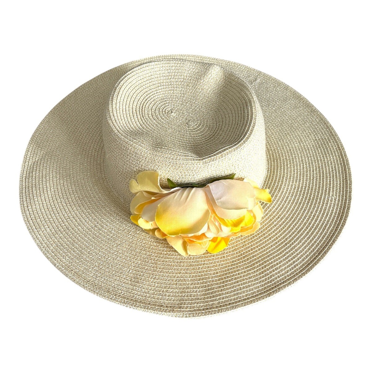 Stylish wide brim sun hat by Cappelli Straworld featuring a neutral paper-braid weave and a large yellow/cream fabric flower accent on the band. Lightweight, flexible, and perfect for spring and summer wear. Includes an adjustable inner tie for a secure fit.