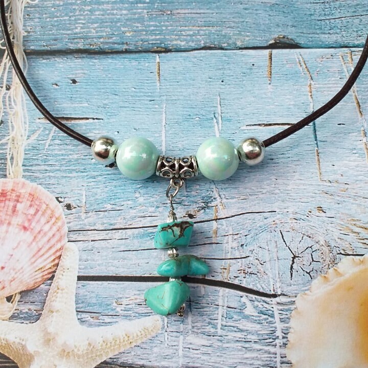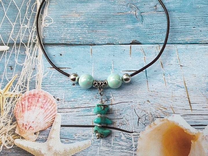 Beautiful silver-tone Bohemia style Turquoise leather necklace. Boho necklace. Bohemian necklace. Ethnic necklace. Gypsy necklace. Hippie necklace. Genuine leather Genuine Turquoise and turquoise -toned plastic pearl beads beautiful necklace.