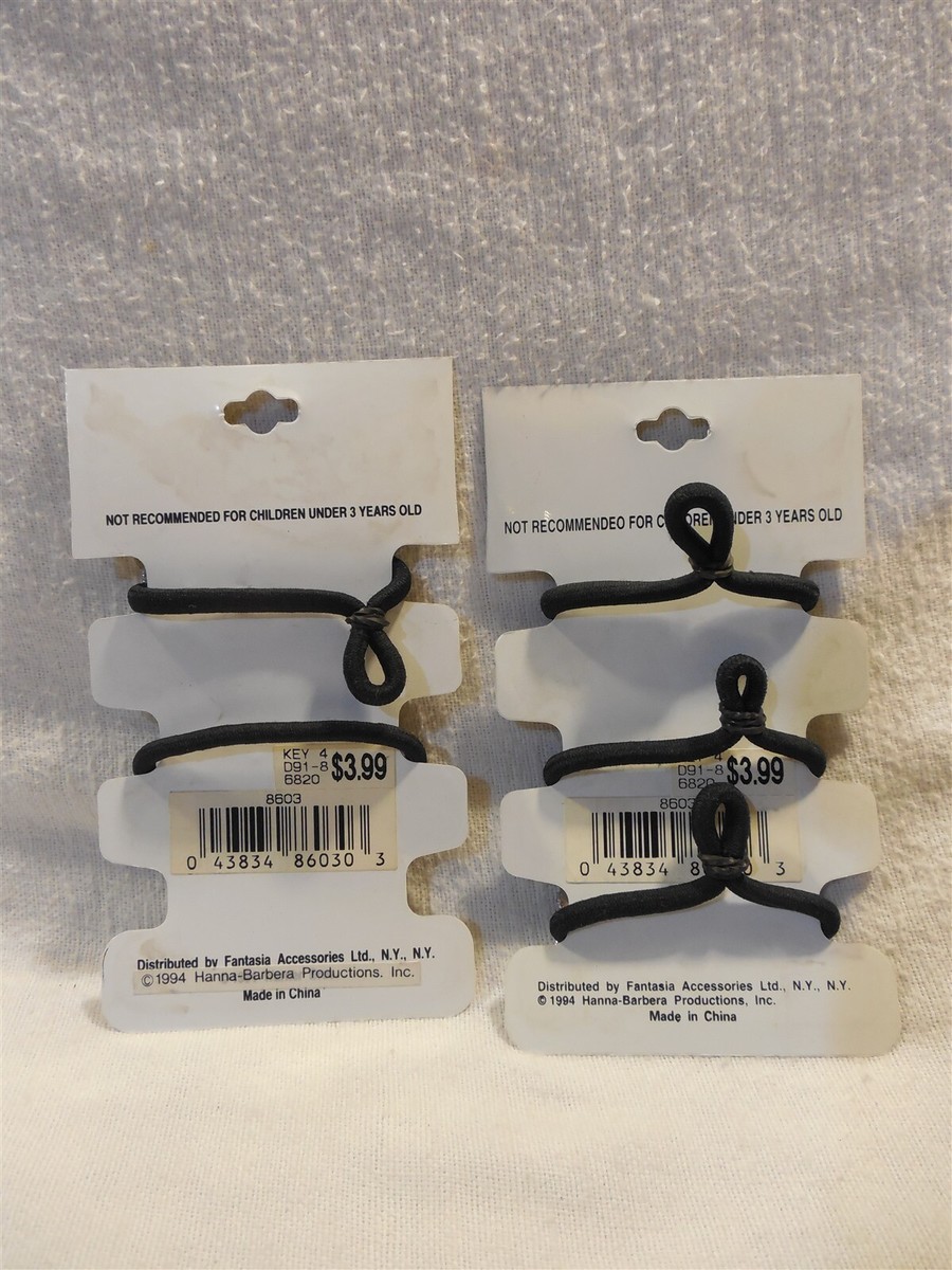 This is a set of Flintstones 1994 Fantasia Accessories bracelets on original hang cards. The set includes Fred Wilma Flintstone on one card and Betty, Bamm-Bamm Barney Rubble on the other card. They have metal pewter looking emblems on black elastic straps. The hang cards measure approximately 3" x 5 1/2".