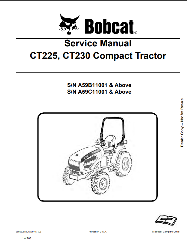 BOBCAT CT225, CT230 A59B11001, A59C11001 & UP SERVICE MANUAL 6986526 (09-15)