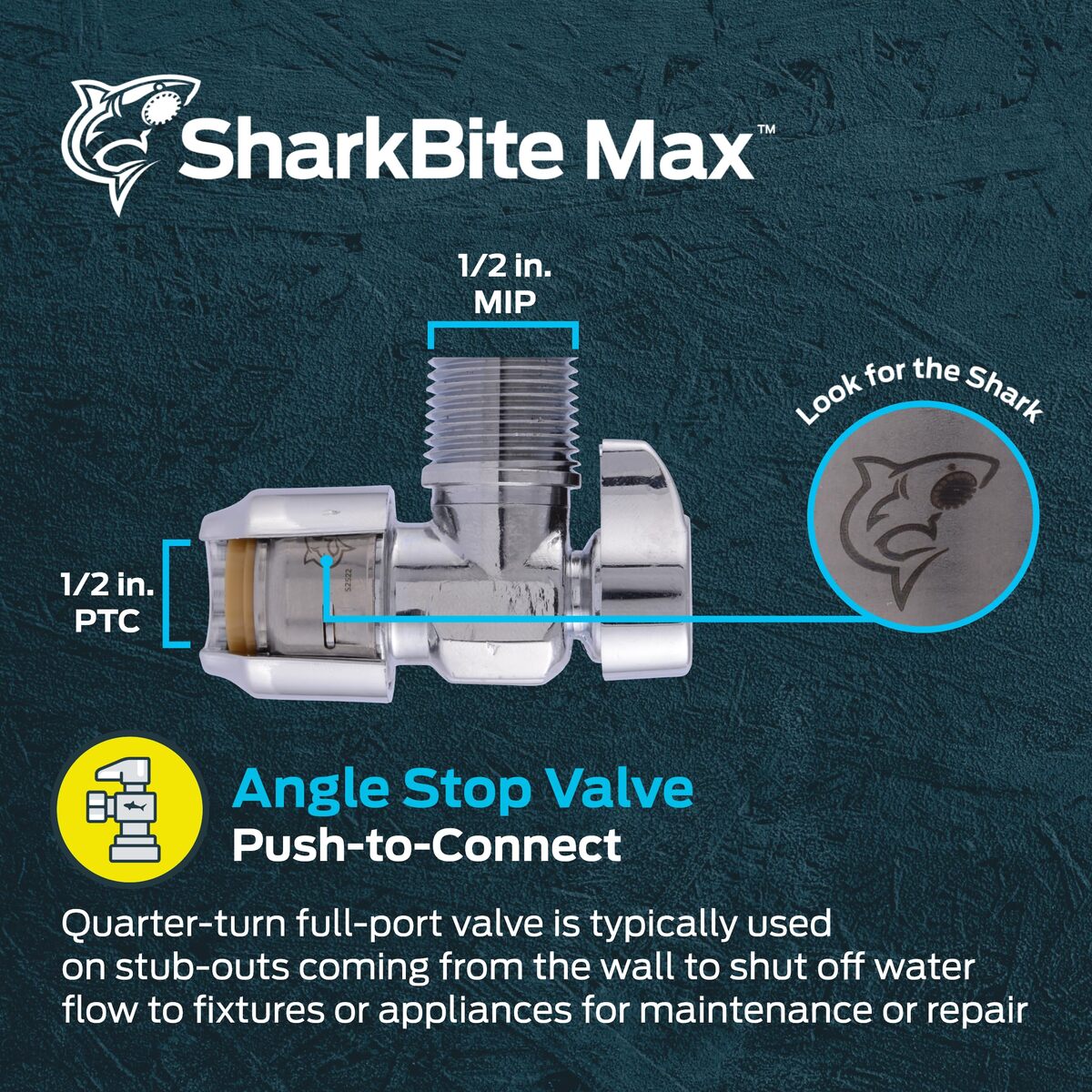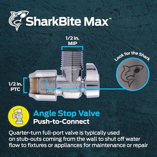 Bullet point: FAST AND EASY INSTALL: SharkBite Max push-to-connect brass push angle stop valves are used on stub-outs coming out of the wall and used to control and shut-off water flow in existing PEX, copper, CPVC, PE-RT and SDR-9 HDPE pipes. No need for soldering, glue, or additional tools; pipe connector can be installed in wet lines and ideal for working in tight spaces