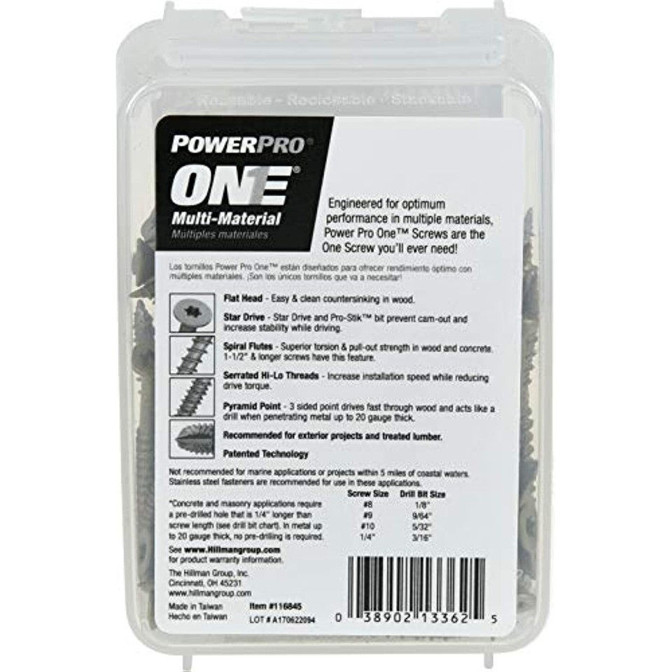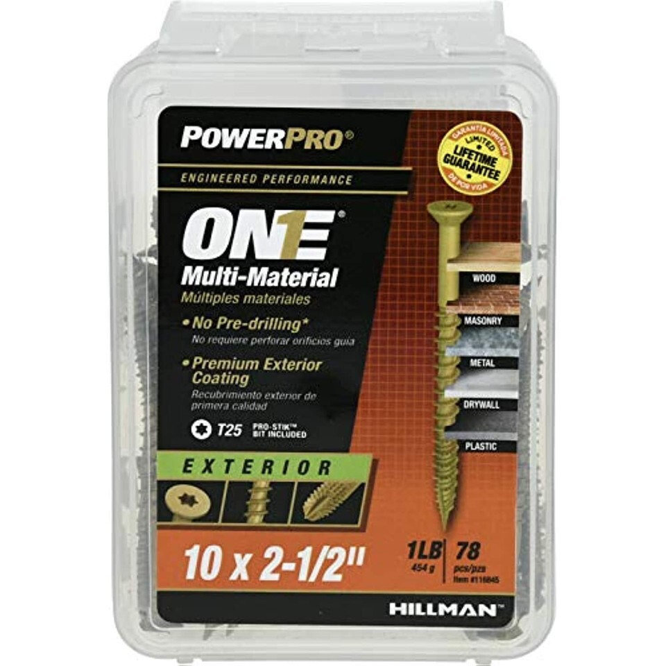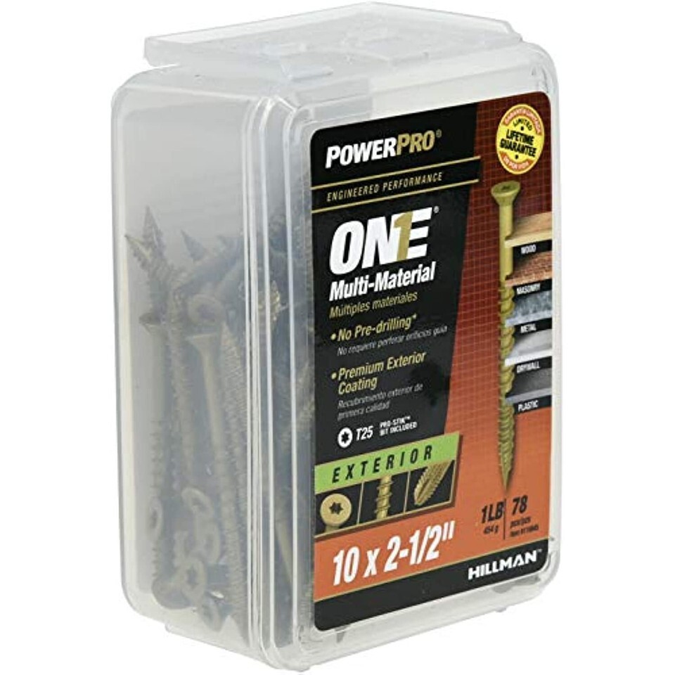 Engineered for optimum performance in multiple materials, Power Pro One screws are the One screw you'll ever need. Developed to outperform and replace standard wood, sheet metal, and concrete/masonry screws, the One Screw program simplifies your tool box by using a single, innovative, engineered screw design to satisfy projects that fasten into wood, metal, concrete, drywall, and plastic. The bronze epoxy coating is recommended for exterior projects and treated lumber (Not recommended for marine applications or projects within 5 miles of coastal waters). The flat head design and star drive provide easy and clean countersinking into wood. Manufactured with spiral flutes, serrated hi-lo threads, and a 3-sided pyramid point, no pre-drilling is required in wood, drywall, plastic, or metal up to 20 gauge thick. Concrete and masonry applications require a pre-drilled a hole, see product packaging for pre-drilling instructions. Each package includes a free durable Pro-Stik Star Driver Bit. All One Screw products offer a limited lifetime .