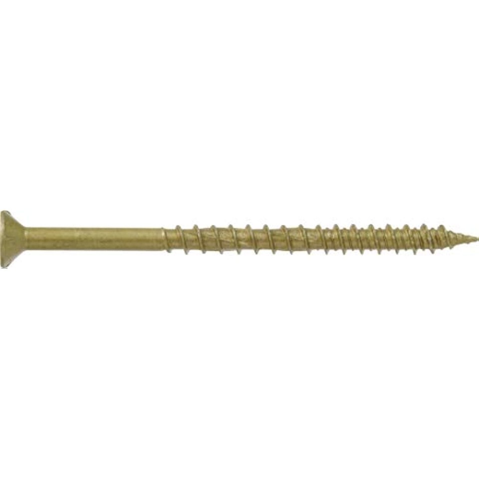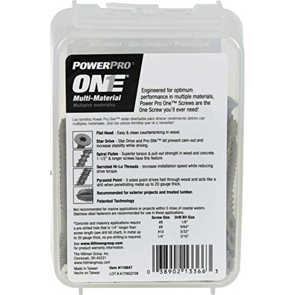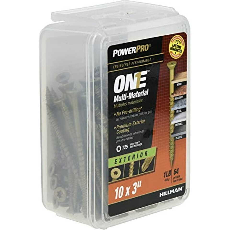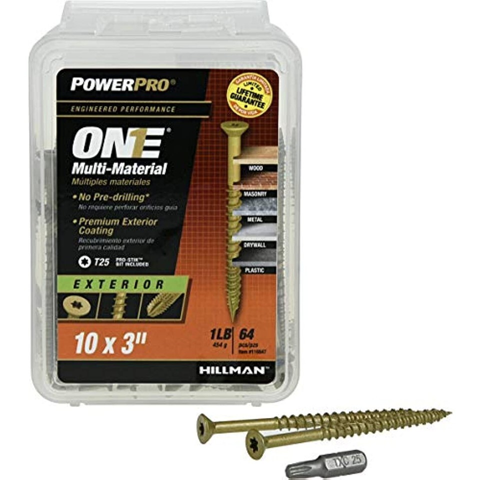 Engineered for optimum performance in multiple materials, Power Pro ONE screws are the ONE screw you'll ever need. Developed to outperform and replace standard wood, sheet metal, and concrete/masonry screws, the One Screw program simplifies your tool box by using a single, innovative, engineered screw design to satisfy projects that fasten into wood, metal, concrete, drywall, and plastic. The bronze epoxy coating is recommended for exterior projects and treated lumber (Not recommended for marine applications or projects within 5 miles of coastal waters). The flat head design and star drive provide easy and clean countersinking into wood. Manufactured with spiral flutes, serrated hi-lo threads, and a 3-sided pyramid point, no pre-drilling is required in wood, drywall, plastic, or metal up to 20 gauge thick. Concrete and masonry applications require a pre-drilled a hole, see product packaging for pre-drilling instructions. Each package includes a free durable Pro-Stik Star Driver Bit. All ONE Screw products offer a limited lifetime.