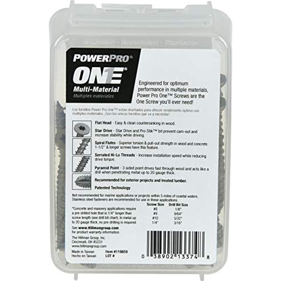 Engineered for optimum performance in multiple materials, Power Pro ONE screws are the ONE screw you'll ever need. Developed to outperform and replace standard wood, sheet metal, and concrete/masonry screws, the One Screw program simplifies your tool box by using a single, innovative, engineered screw design to satisfy projects that fasten into wood, metal, concrete, drywall, and plastic. The bronze epoxy coating is recommended for exterior projects and treated lumber (Not recommended for marine applications or projects within 5 miles of coastal waters). The flat head design and star drive provide easy and clean countersinking into wood. Manufactured with spiral flutes, serrated hi-lo threads, and a 3-sided pyramid point, no pre-drilling is required in wood, drywall, plastic, or metal up to 20 gauge thick. Concrete and masonry applications require a pre-drilled a hole, see product packaging for pre-drilling instructions. Each package includes a free durable Pro-Stik Star Driver Bit. All ONE Screw products offer a limited lifetime.