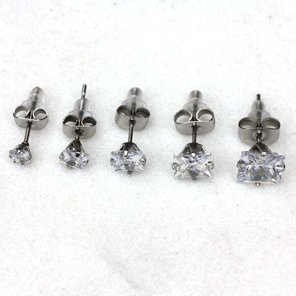 316L Surgical Steel Clear Princess Cut CZ Stud Earring.316L Surgical Steel Stud Earring with finest prong set Cubic Zirconia. Each Earring comes with a metal clutch and a rubber clutch. A grooved post helps to prevent the loss of the clutch. Available in 5 CZ sizes.