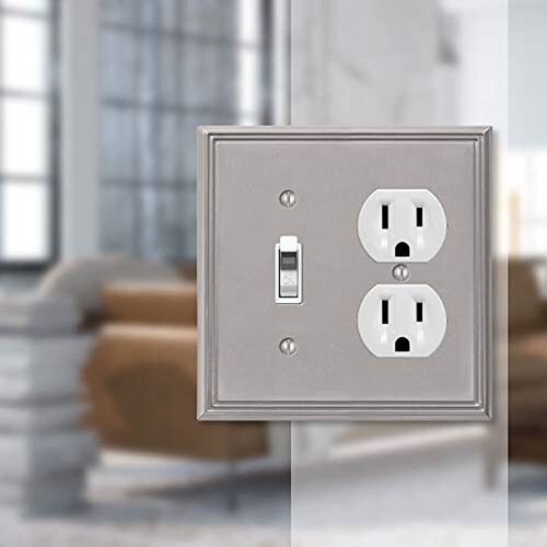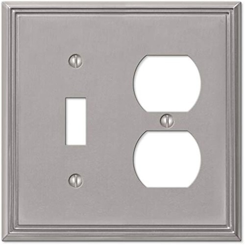 PRODUCT DETAILS: Size: 1 Toggle / 1 Duplex Outlet Wallplate | Style: Modern | Material: Cast Metal | Finish: Brushed Nickel | Dimensions: 0.25 (L) x 4.75 (W) x 4.75 (H) | UL Listed, Screws and Mounting Hardware Included