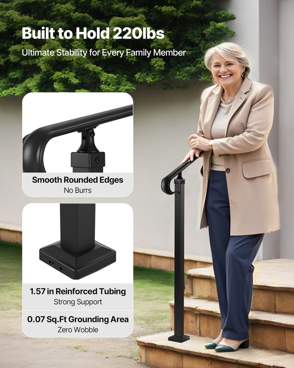 220 lbs Load Capacity: This durable outdoor stair railing ensures security for elderly and pregnant women with a thickened grip for comfort. NOTE: Measure your stairs' center distance and height difference to ensure compatibility before purchasing