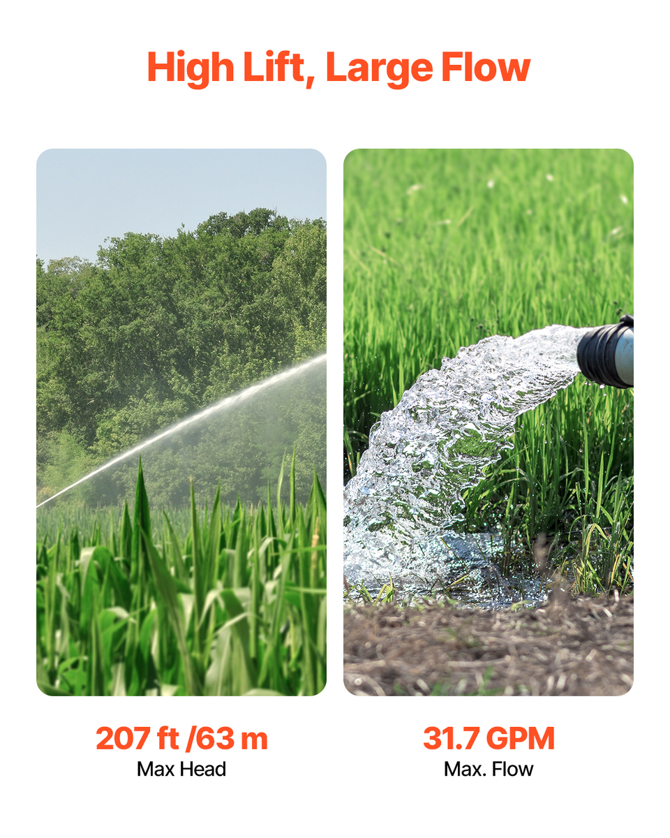 Large Flow, High Lift: This deep well submersible pump delivers 1.8HP input power and 1HP output, offering exceptional flow and lift capabilities. With a maximum lift of 207 ft (63 m) and a flow rate of up to 31.7 GPM, it meets a wide range of water supply needs. Enjoy strong water pressure and a continuous, reliable flow across multiple applications.