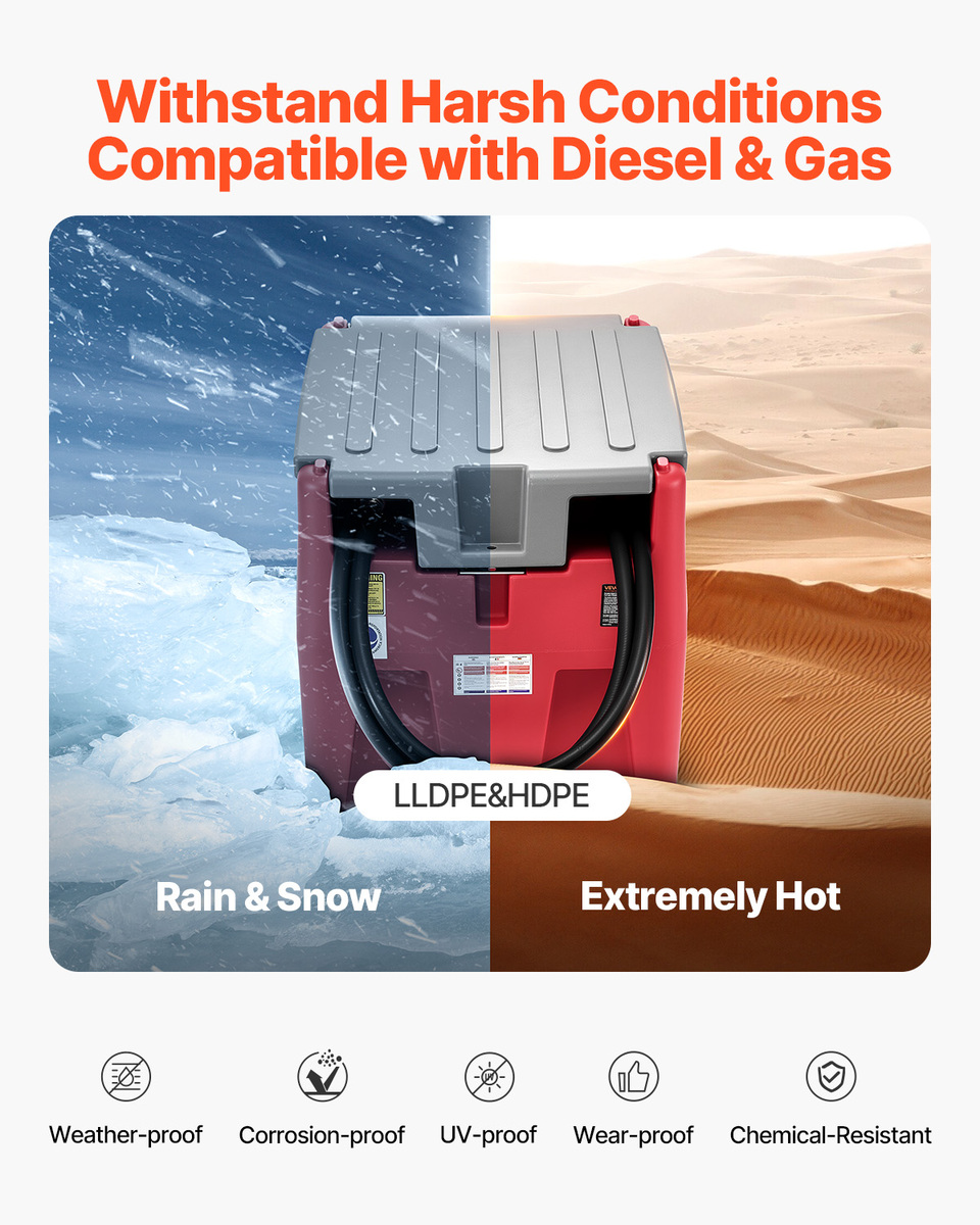 Robust Tank Construction: Color: Red. Our portable diesel tank is constructed of high-quality polyethylene material, capable of handling changing weather conditions, and resists UV radiation. The upper lid is lockable by a copper lock that guards against theft and ensures the security of operation. Put your tank first and get the job done right.