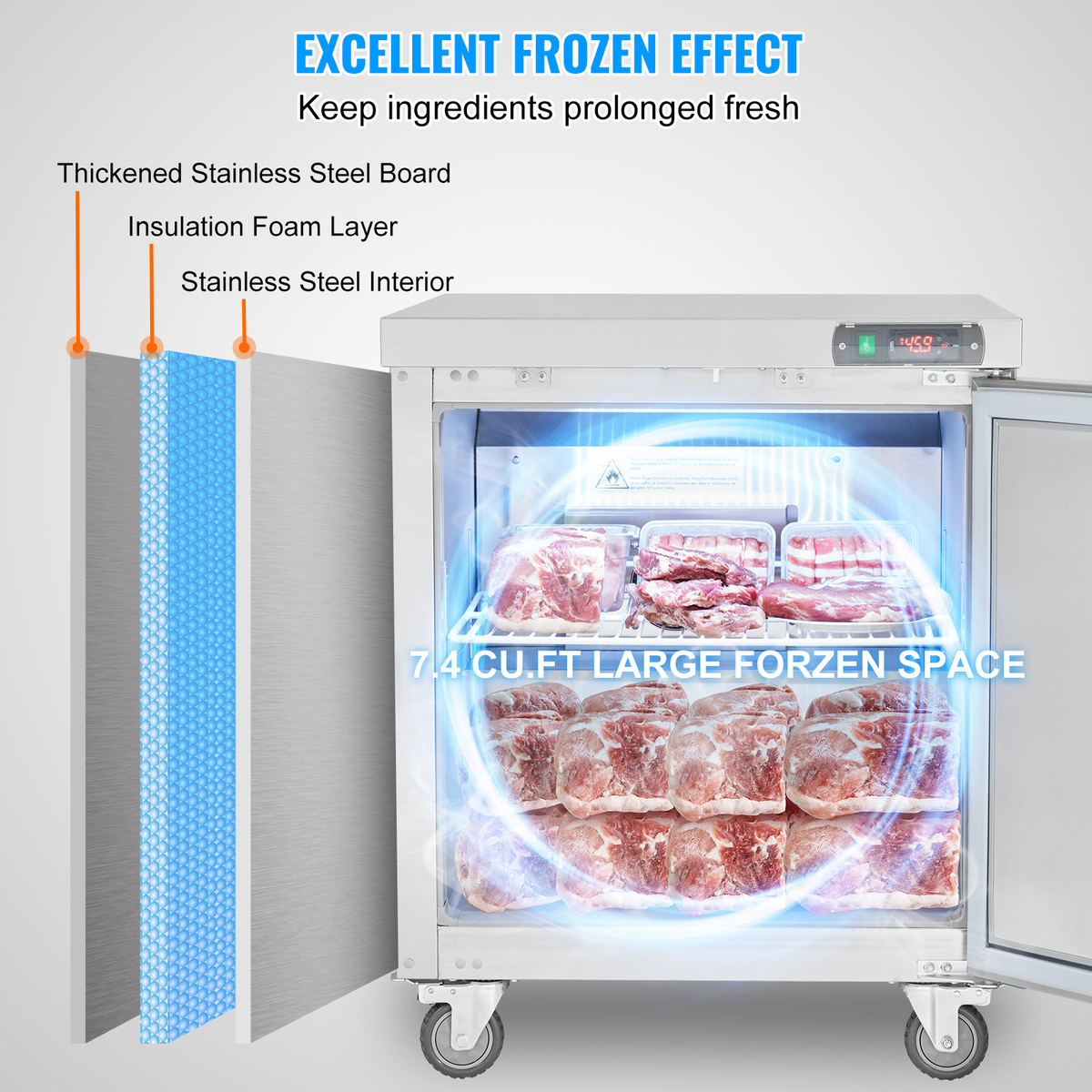 7.4 Cu.Ft Capacity: This large-capacity frozen prep table features a digital control screen to maintain internal temperatures between 0~-8? / -18 ~ -22?. Adjustable shelves allow for dual-zone storage, and internal lighting makes it easier to access and organize items.