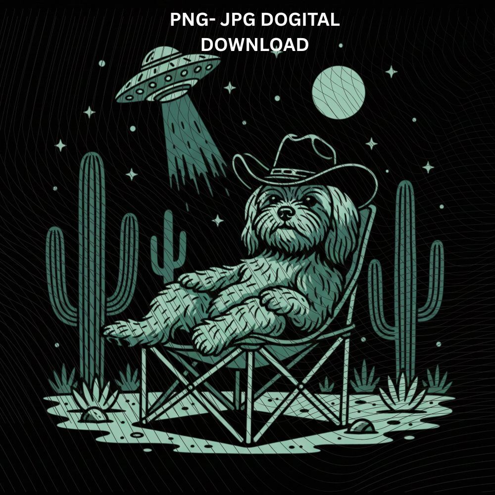 Maltese Cowboy Under UFO Png, Alien Maltese Dog Western, Desert Space Graphic