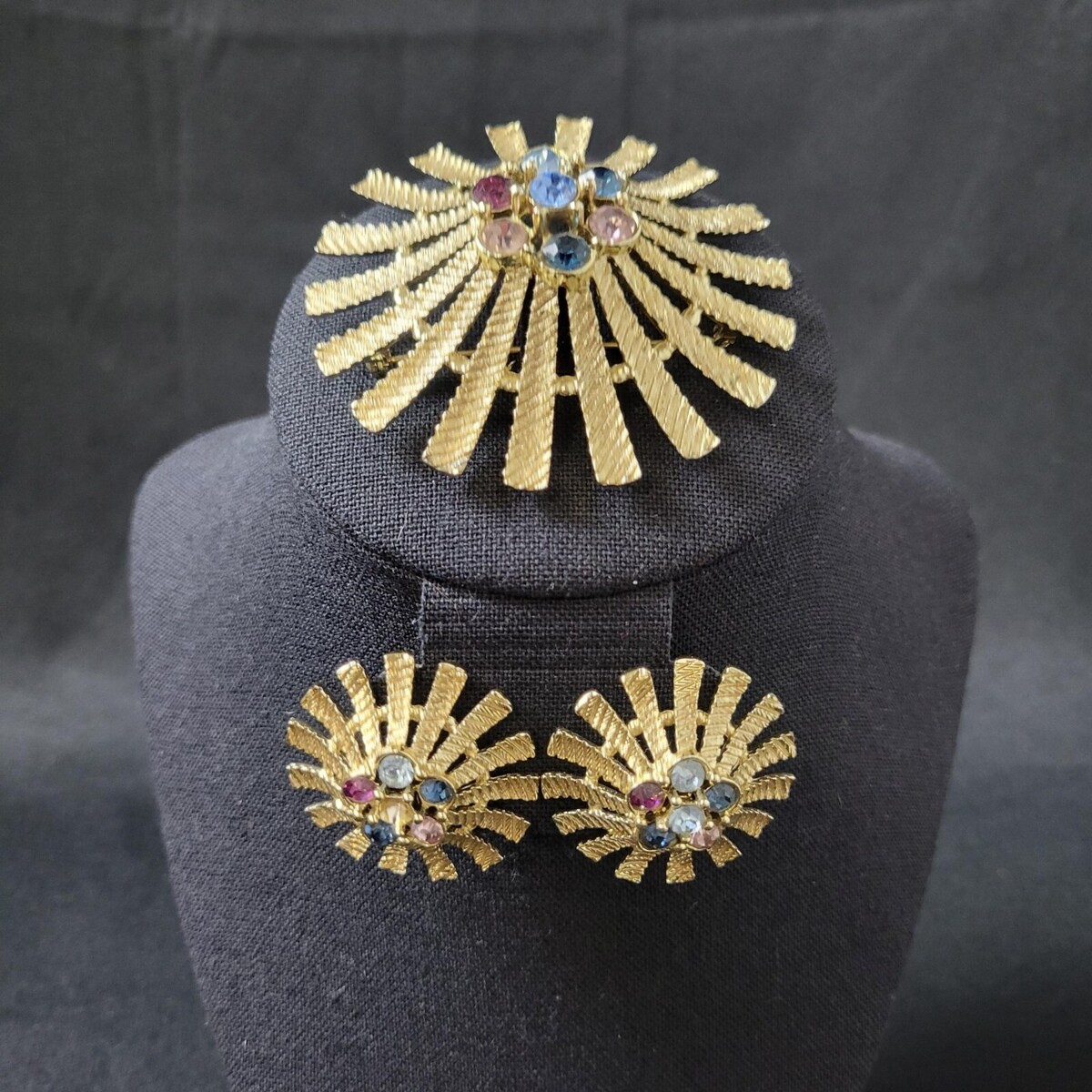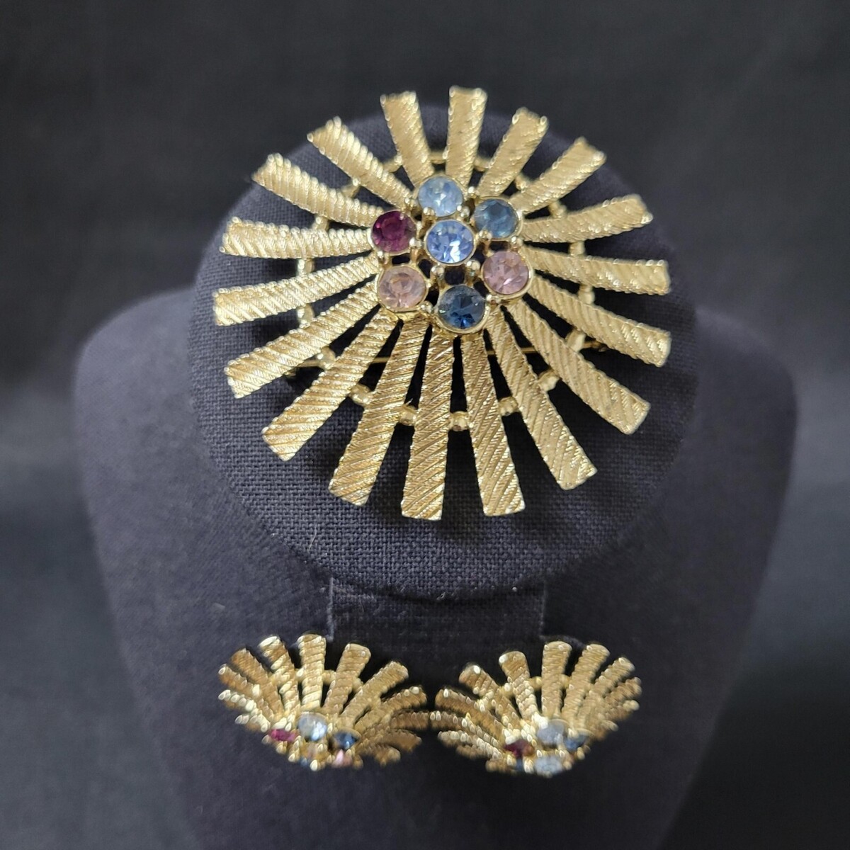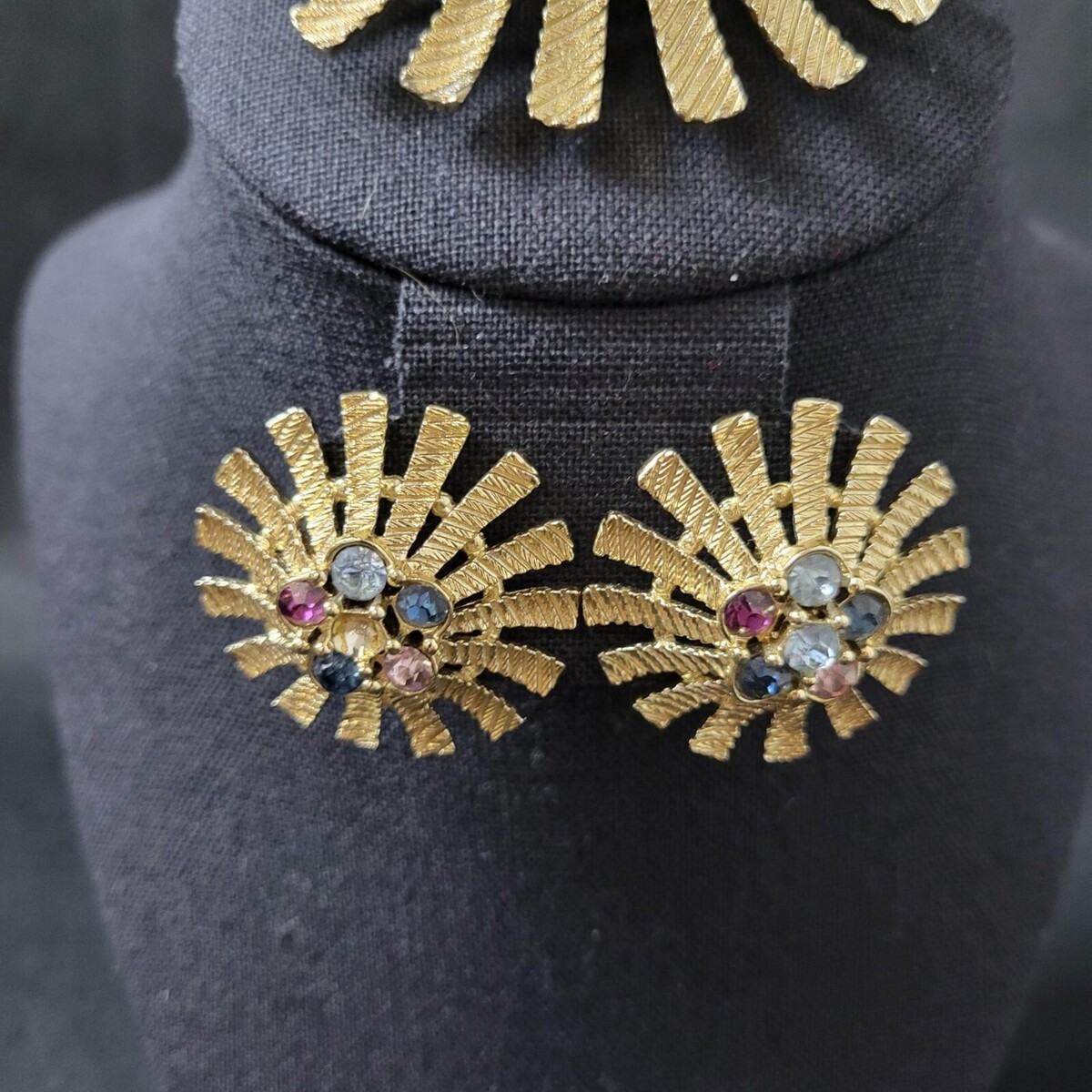 READ Vtg Emmons Gold Tone Brooch Earring Set Multicolor Rhinestones Starburst