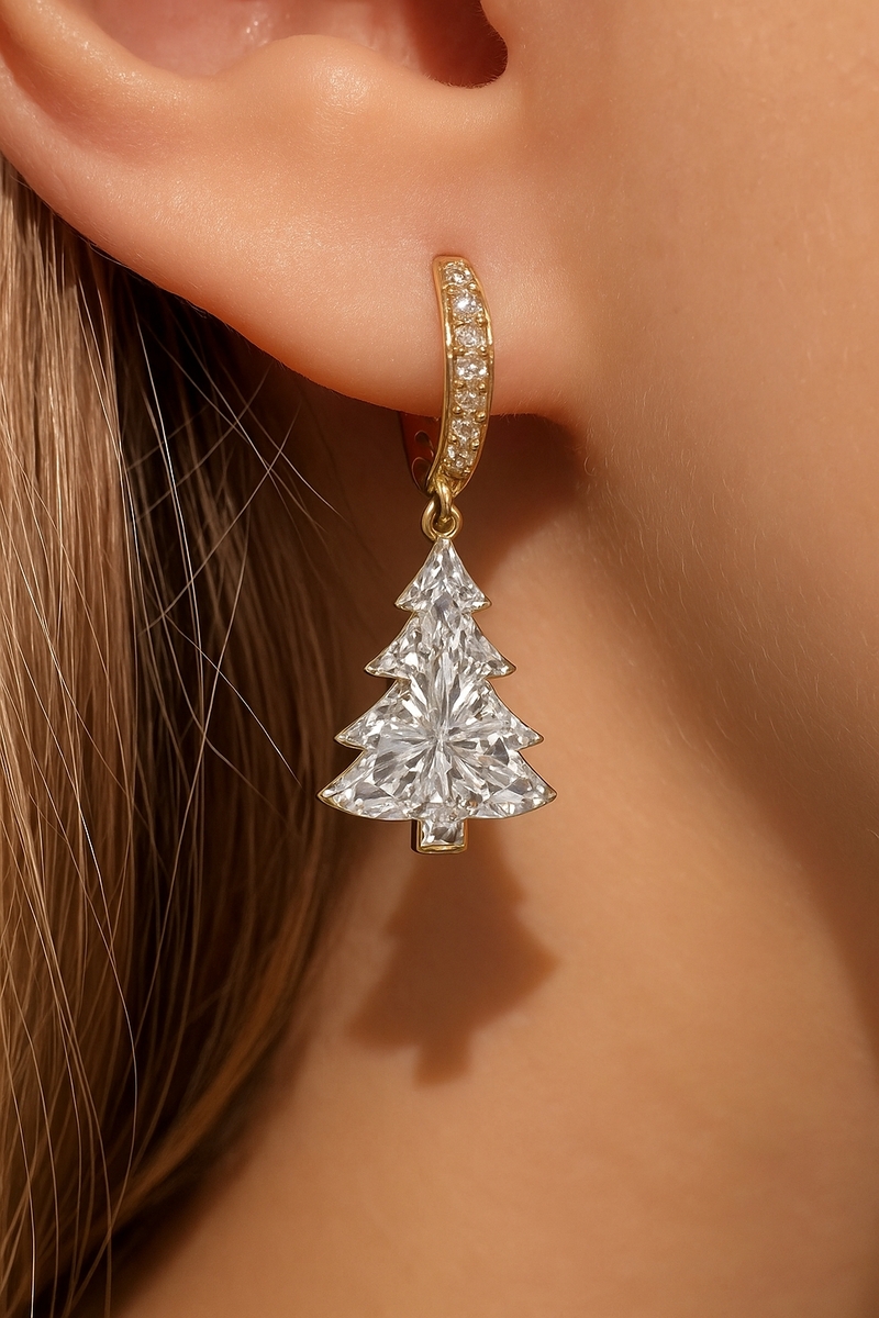Celebrate the magic of the holiday season with this exquisite Christmas tree-shaped Diamond . Crafted from elegant 18k gold, this pendant Ear Ring features a unique and festive design that perfectly captures the spirit of Christmas. Adorned with sparkling lab diamonds totaling 1/2 carat, it radiates a beautiful brilliance, making it a standout piece fo any holiday celebration.