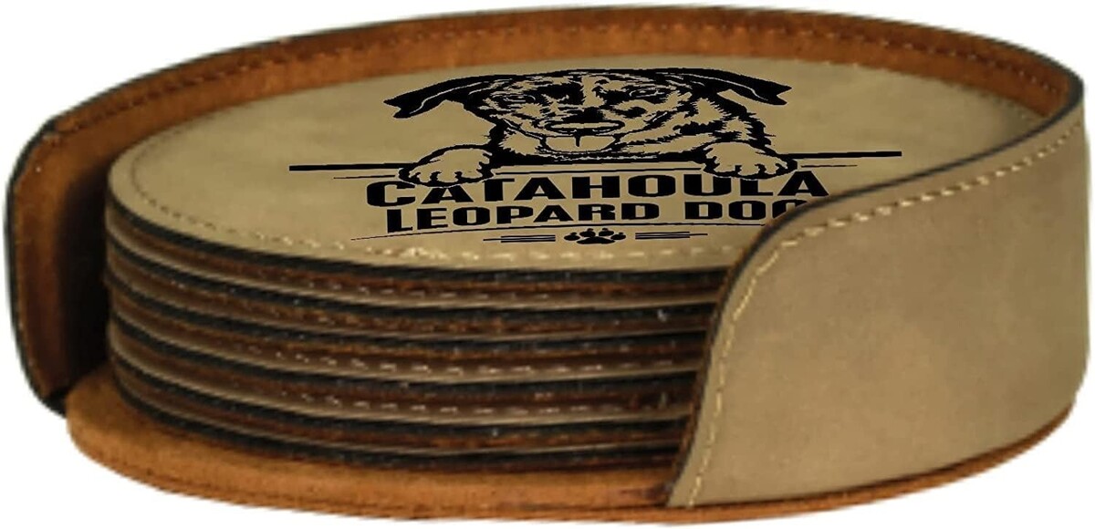 Catahoula Leopard Dog 4" Round Leather 6-Coaster Set with Holder-Brown / Black
