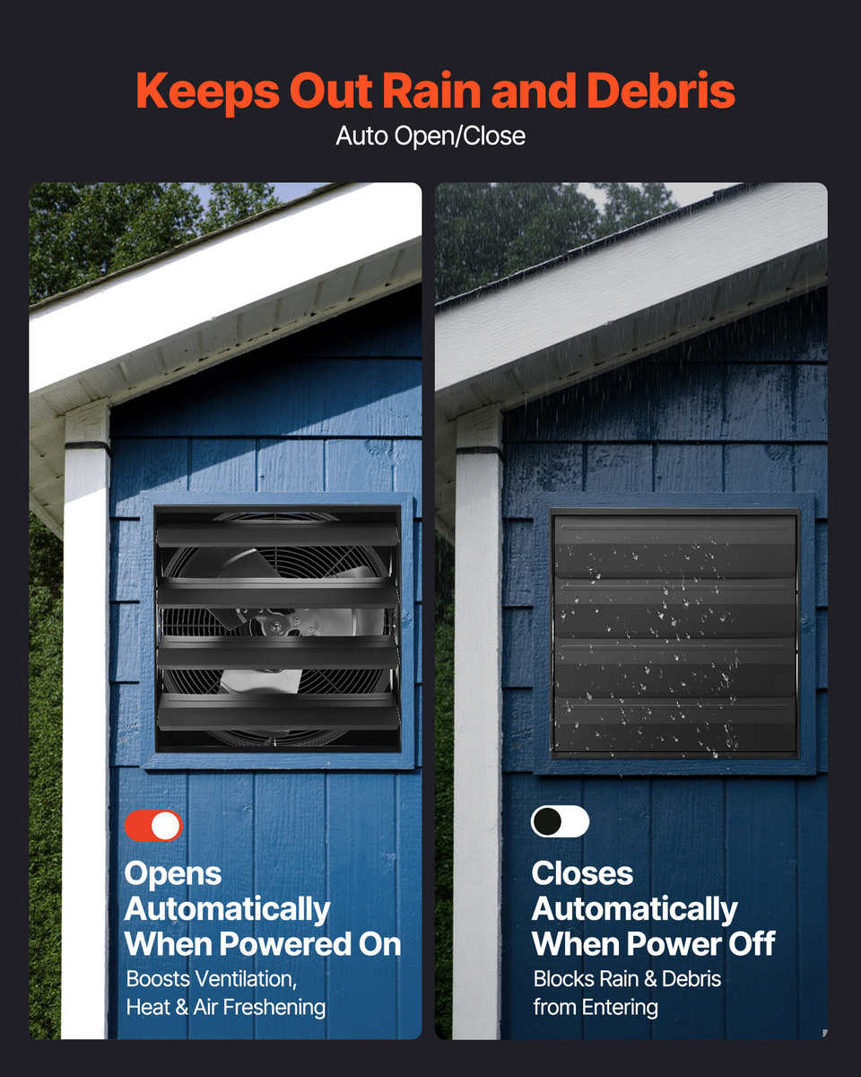Rain Guard: Shutters open when powered for ventilation and deodorizing, then close when off to block rain and small things, reliable protection for an attic exhaust fan setup