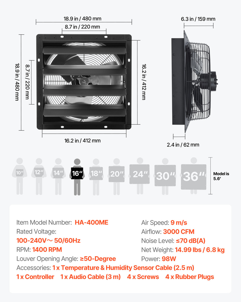 VEVOR 16.2" Shutter Exhaust Attic Fan, Wall Mounted, Smart Temperature Control