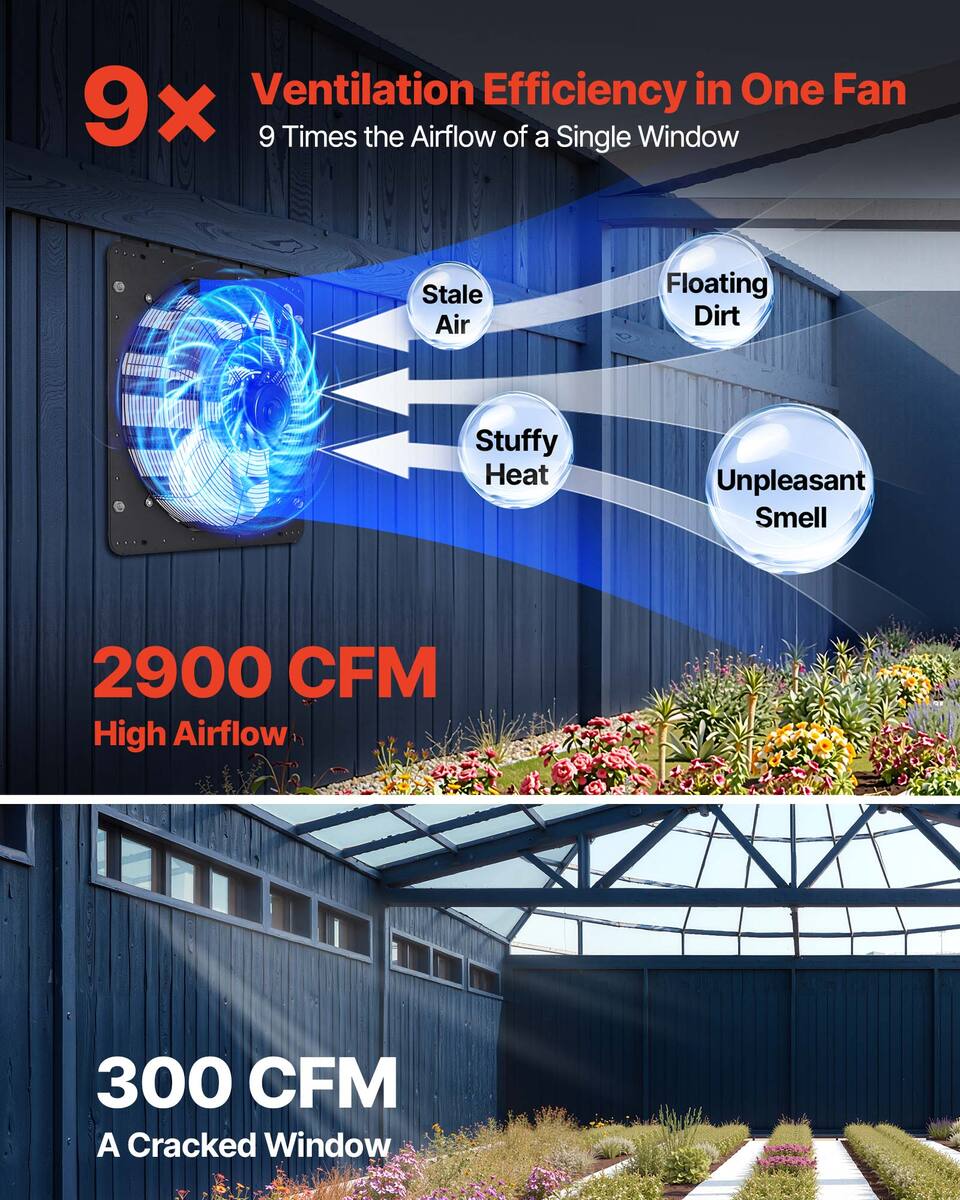 Rapid Venting: This shutter exhaust fan delivers 1500 CFM to quickly expel stale air, floating dirt, heat, and smells, keeping indoor air fresh. Also works as a high-airflow exhaust fan for sheds and workshops