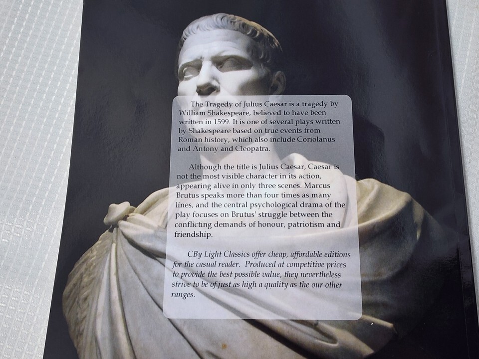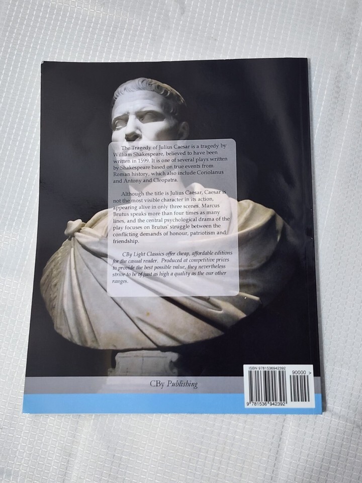 item: Discover the gripping tale of ambition, betrayal, and politics with William Shakespeare's timeless classic, "The Tragedy of Julius Caesar." This edition brings to life the stirring story of Caesar's downfall and the ensuing struggle for power, captured through eloquent prose and compelling dialogue. Ideal for both students and enthusiasts of Shakespeare, this book offers a profound exploration of themes like honor, loyalty, and the corrupting influence of power. Dive into the pages of history and experience a masterpiece that continues to resonate with readers around the globe. Whether you're adding to your collection or discovering Shakespeare for the first time, this edition promises to enchant and engage.