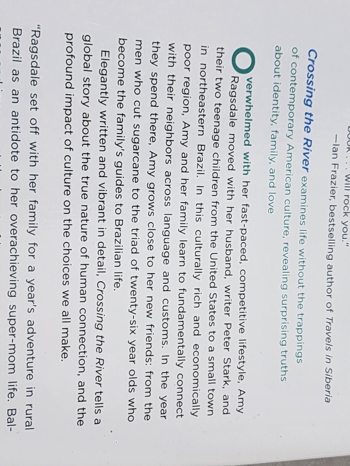 item: Crossing the River: A Life in Brazil by Amy Ragsdale is a vivid travel literature and memoir that delves into the author's transformative experiences after relocating from the United States to a small town in northeastern Brazil. This move was driven by her desire to escape the fast-paced, competitive lifestyle she and her family were immersed in. The book describes how Ragsdale, her husband, and their teenage children adapt to a radically different cultural and economic environment, forming deep connections with local residents. Their integration into the community provides a unique window into rural Brazilian life, marked by simplicity and profound interpersonal relationships. Through her narrative, Ragsdale explores themes of identity, family, and the meaning of home, offering insights into the ways less materialistic cultures can enrich one's life. The memoir is noted for its elegant prose and the evocative portrayal of the Brazilian landscape and its people, making it a compelling read for anyone interested in stories of cultural immersion and personal growth.