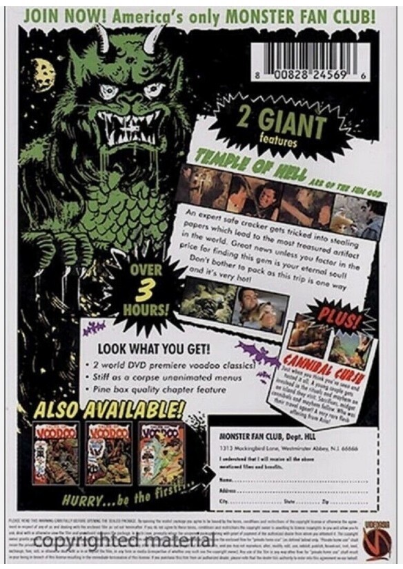Description of item: Dive into the dark world of jungle horror with Tales of Voodoo ? Volume 4, featuring two blood-soaked cult classics: Temple of Hell and Cannibal Curse. In Temple of Hell, an expert safecracker is lured into stealing ancient papers that lead to the world?s most powerful artifacts?only to pay a terrifying price for his greed. Cannibal Curse unleashes a savage tale of voodoo vengeance and primal fear deep in the heart of the jungle. Together, these shocking features deliver over three hours of nonstop thrills, packed with eerie rituals, exotic locations, and vintage exploitation horror at its wildest. A must-have for collectors of grindhouse, horror, and retro B-movie cinema.