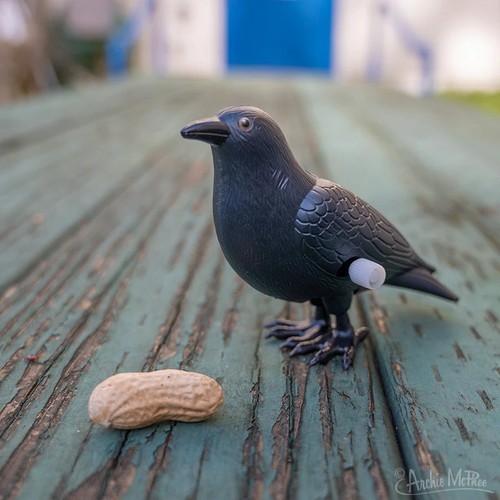 Crows spend most of their time in a happy and playful mood. This crow is a little crazy, probably because a seagull just ate its peanut. You?ll get a 3-1/8" (7.9 cm) tall, hard vinyl wind-up crow that skitters around when you wind it up, pecking at invisible frustrations.