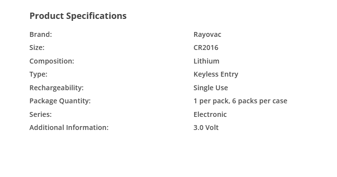 Description of item: This Rayovac Electronic Keyless Entry Battery is a reliable choice for your needs. With a voltage of 3V and a battery size of CR2016, it is perfect for multipurpose batteries and power. The lithium chemical composition ensures a long-lasting performance. This battery is a coin cell/button type and comes in a pack of 6. It is suitable for use in various consumer electronics devices. Don't miss out on this opportunity to add a dependable battery to your collection.