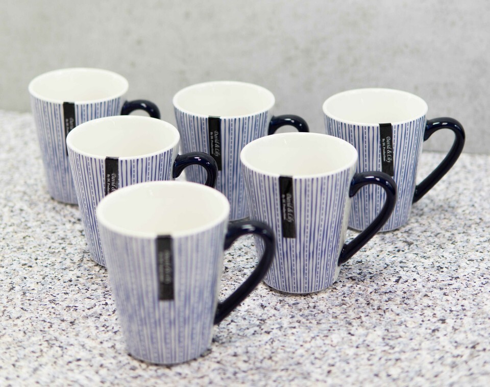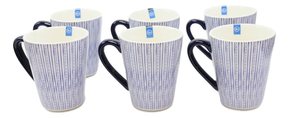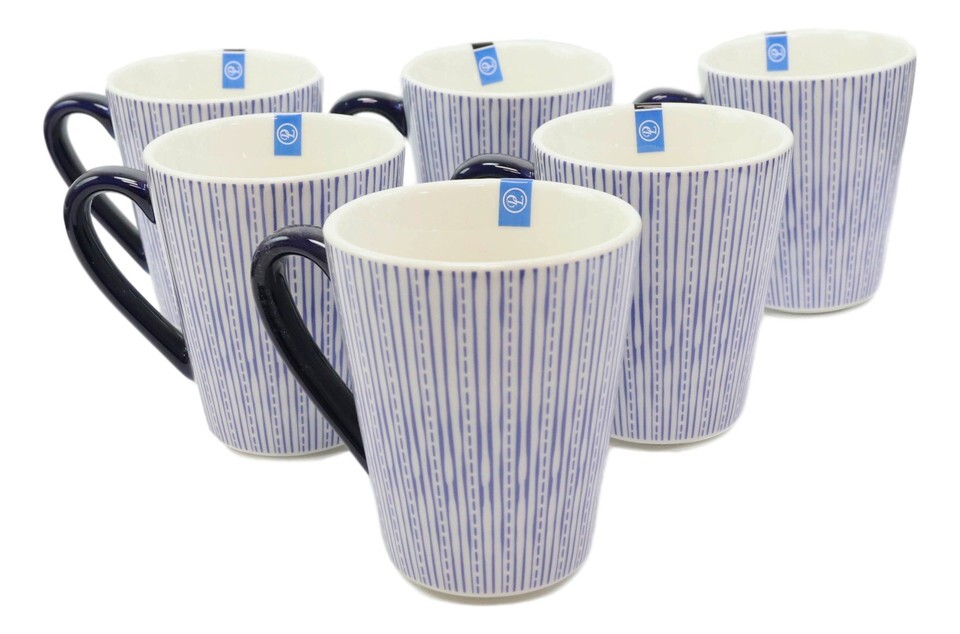 Set of 6 Eleanor Blue And White Linear Patterns Contemporary Porcelain Mugs 10oz