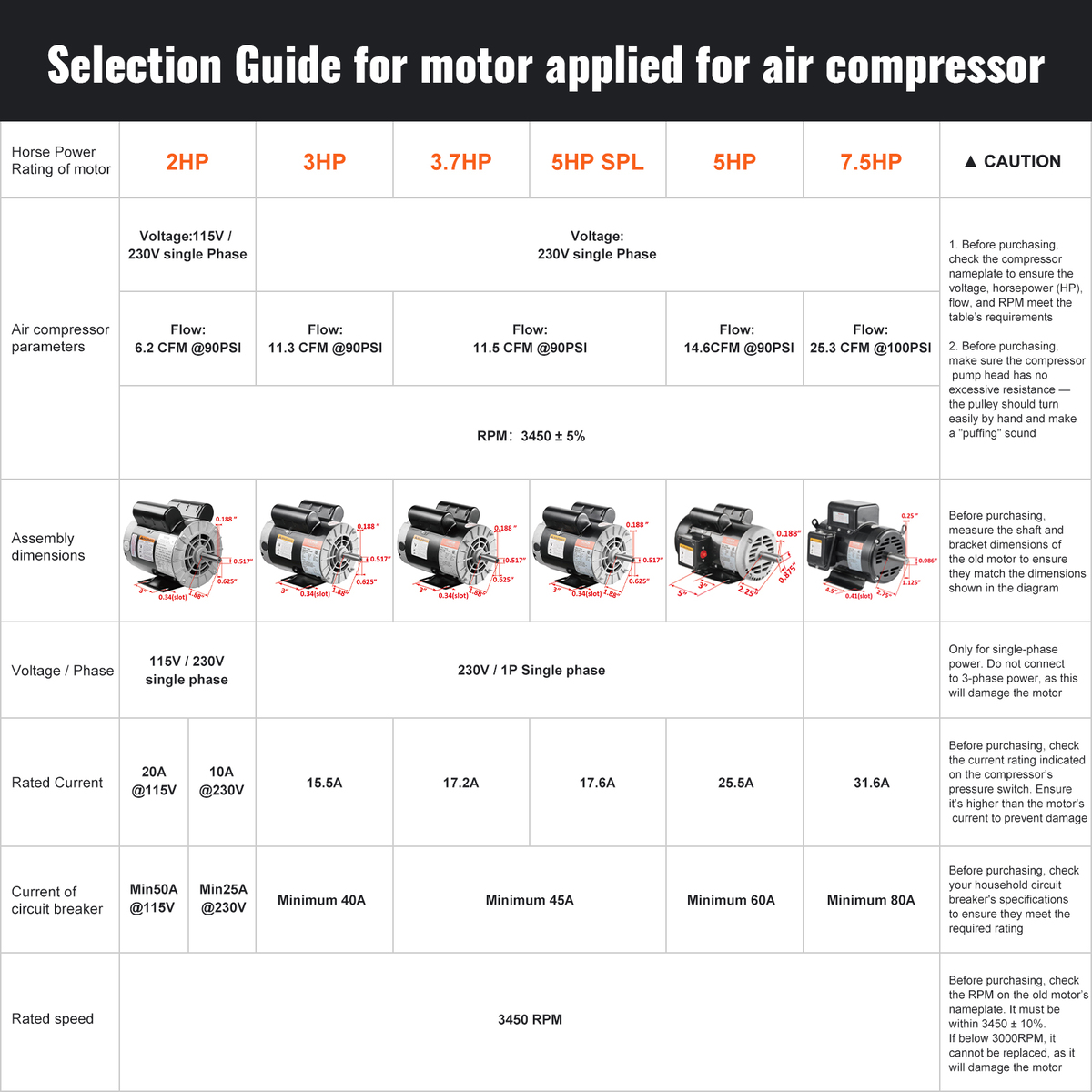 High Performance: 7.5HP, 3450 RPM, Single Phase, Full Load Amps: 31.6Amp, 230V 60Hz, SF: 1.0.