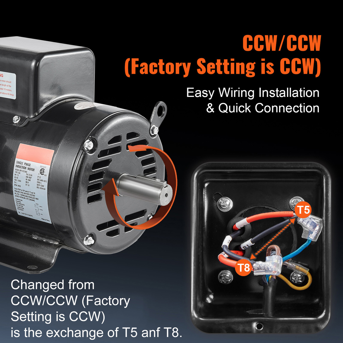 Dual Rotation Direction: Motor is Reversible for CCW/CCW rotation (Factory Setting is CCW), provides easier wiring operations.