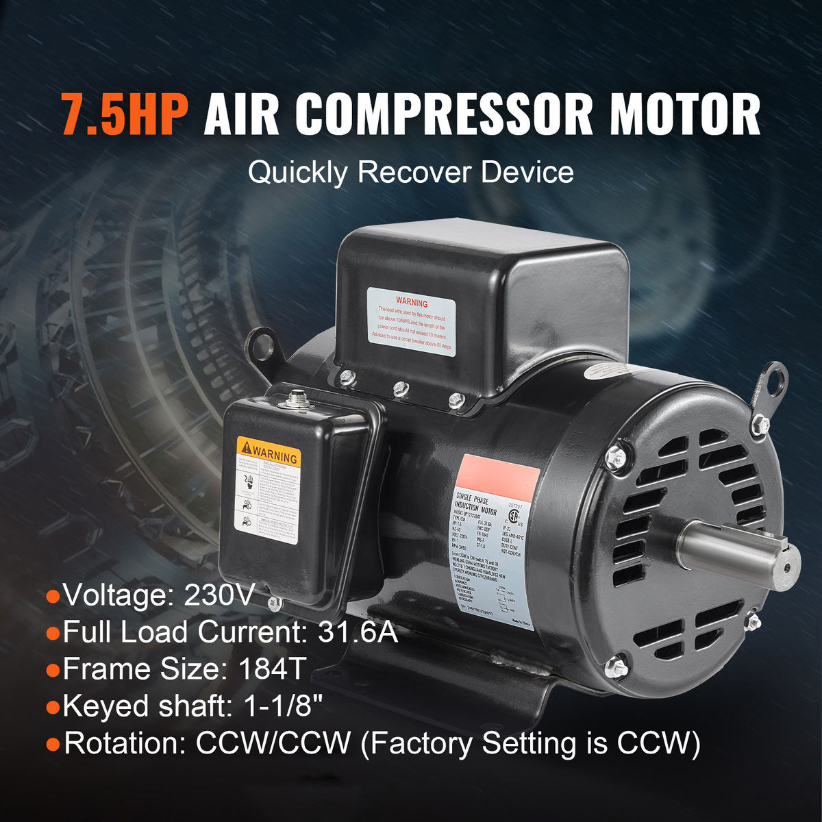 VEVOR 7.5HP Air Compressor Motor, 230V 31.6 Amps Motor, 3450RPM, 184T Frame