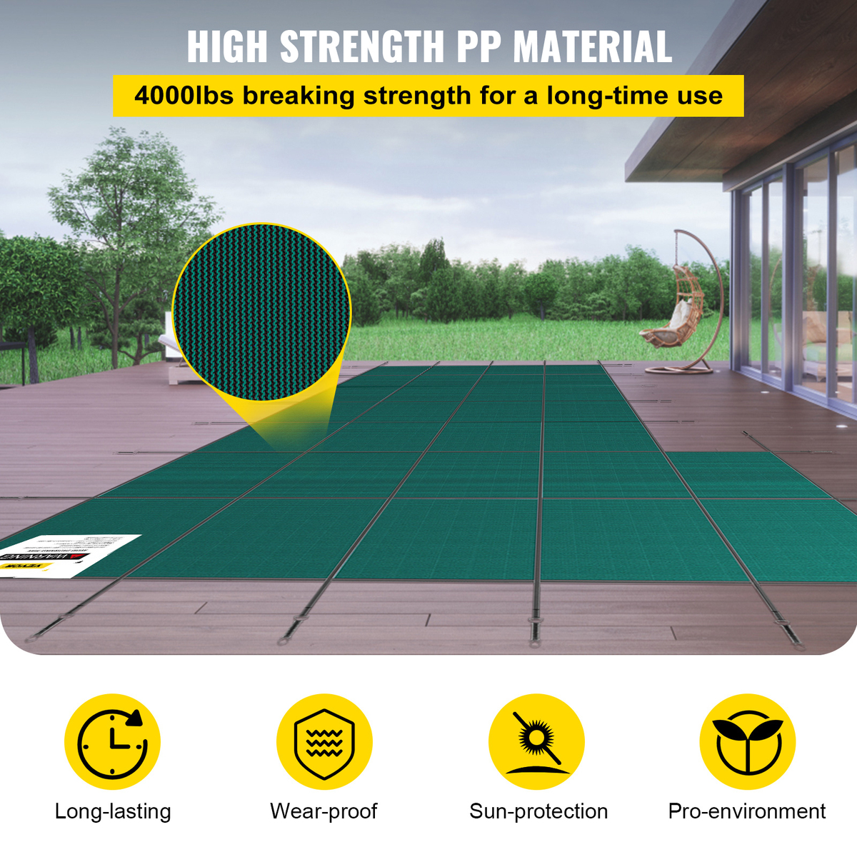 High Strength PP Material: This in-ground pool cover is made of soft and tough polypropylene, making it resistant to aging and abrasion-proof. Double-strapped and triple-stitched, our solid swimming pool cover can serve you for a long time.