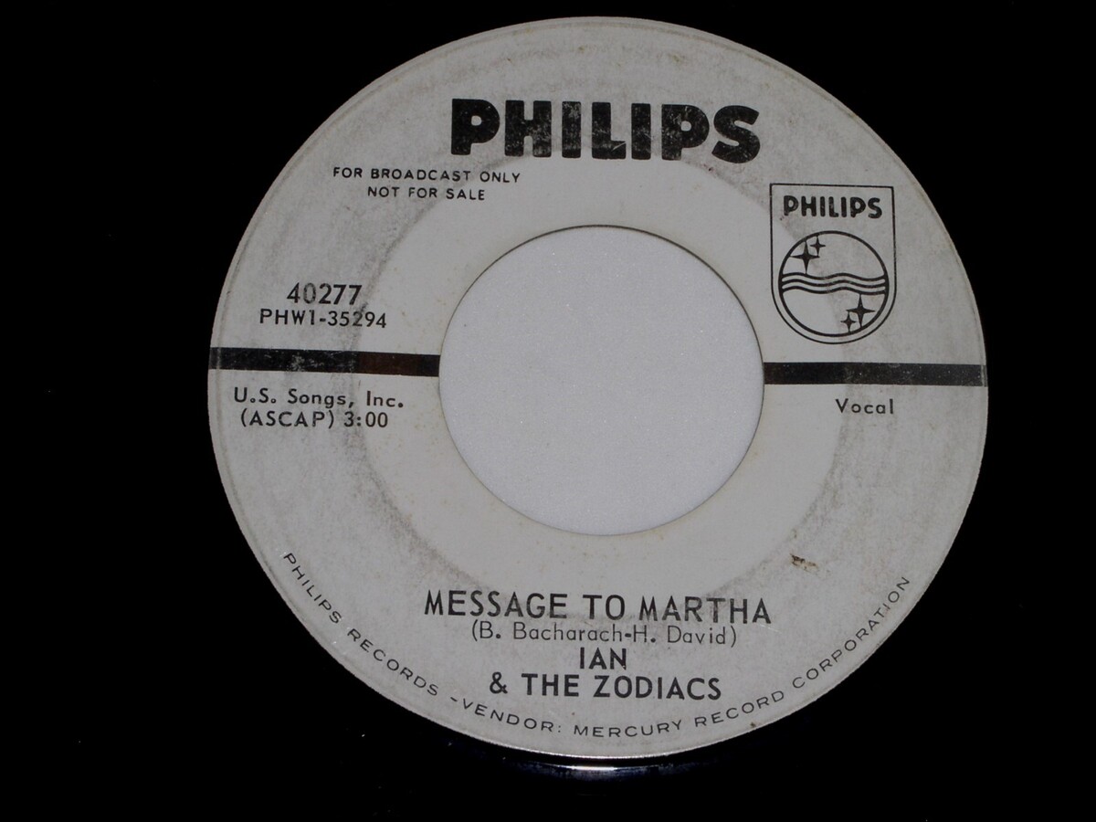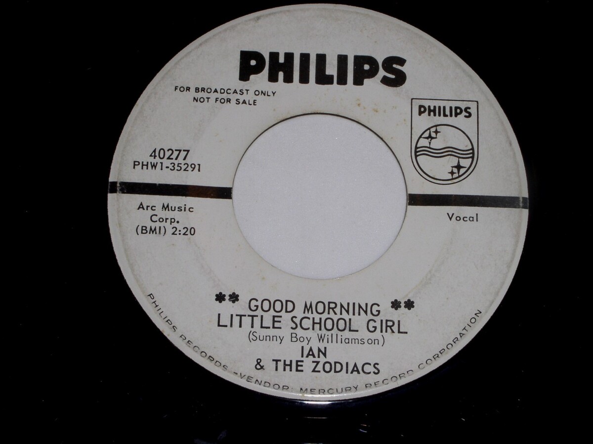 This is a vintage promotional 45 rpm phonograph record by Ian the Zodiacs, entitled, "Good Morning Little School Girl". Flipside: "Message To Martha". Record label: Philips 40277.