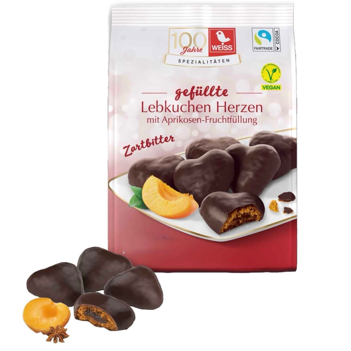 These white gingerbread hearts with dark chocolate filling are truly something special. These delicious gingerbread hearts are shaped like charming hearts and boast a delightful filling inside. A luscious apricot fruit filling enhances this specialty, giving it a particularly fruity note. A coating of fine dark chocolate completes the gingerbread hearts and perfectly evokes the anticipation of the Christmas season.