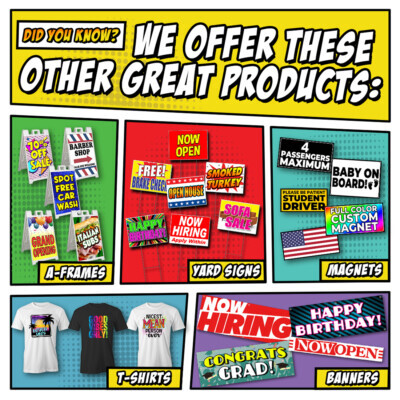 Tampa Printing uses heavy duty premium 13 oz indoor / outdoor vinyl banner material. All banners are printed using industry best latex ink technology, are UV and water resistant, and withstand hot and cold conditions. All banners include metal grommets in each corner for easy hanging. Larger banners receive additional grommets and reinforced hemming along all sides. All banner dimensions are Height (top to bottom in inches) and Width (left to right in inches).