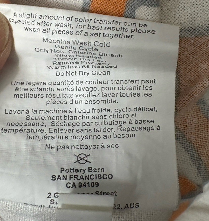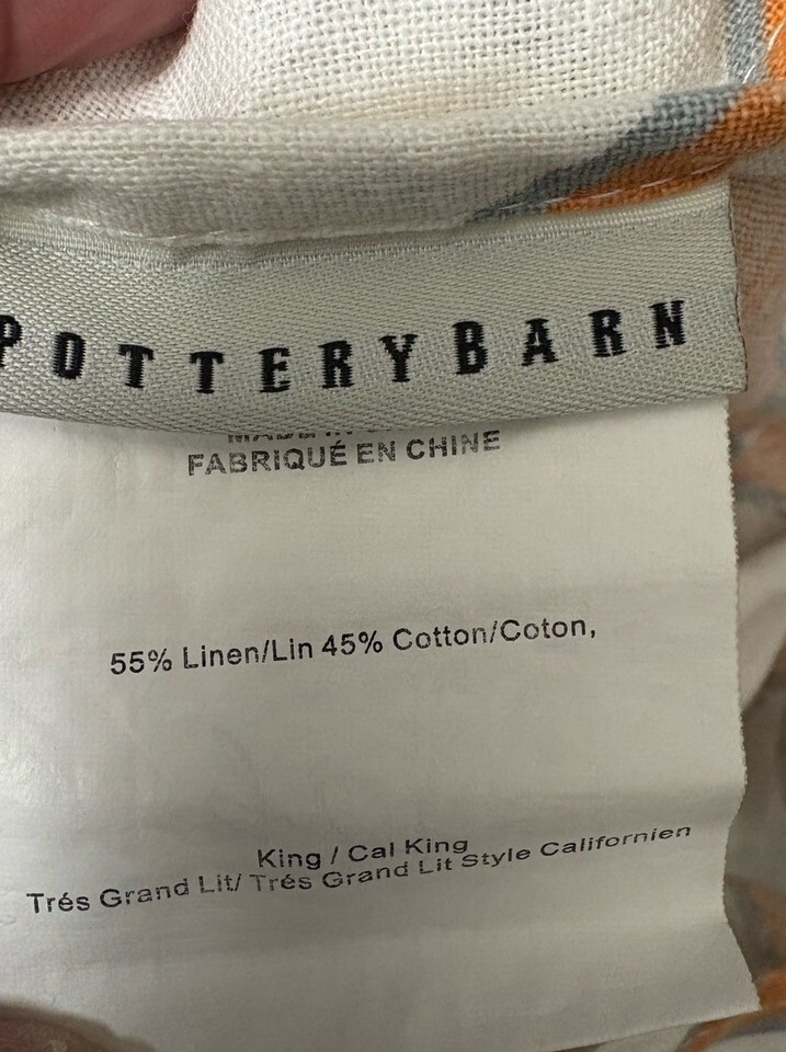 The Pottery Barn KING CAL KING Shelby Geo Trellis Duvet Cover in Clementine Orange is a stylish and luxurious bedding piece for your bedroom. Made from a linen cotton blend, this duvet cover features a geometric pattern in a vibrant clementine orange color. The set includes a duvet cover and is designed for a king size bed, perfect for adding a pop of color and elegance to your bedroom decor. The high-quality 100% cotton fill ensures comfort and warmth, making it a cozy addition to your bed.