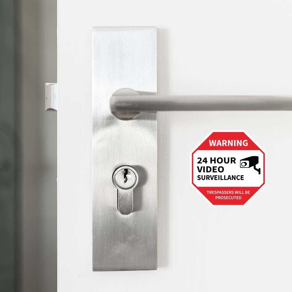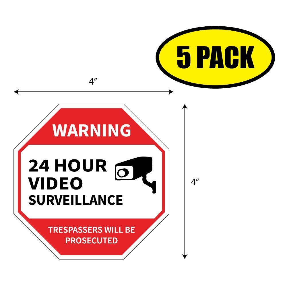 This listing is for a 5 pack of 4" x 4" 'WARNING 24 HOUR SURVEILLANCE' decals.