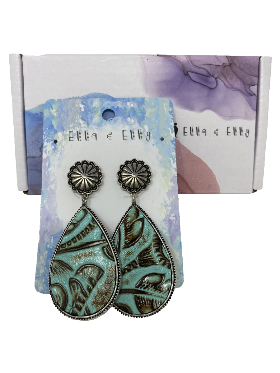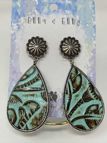 Ella & Elly Silvertone and Teal Embossed Teardrop Stud Earrings NEW