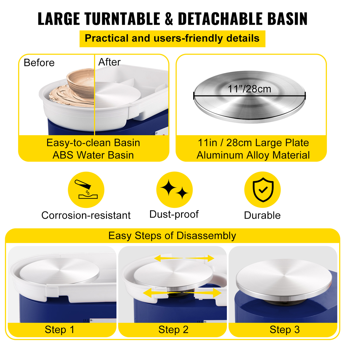 11" Aluminum Alloy Wheel: 11" / 28 cm large aluminum alloy turntable allows users to draw large pieces quickly. Besides, an enclosed water basin prevents mud from eroding and penetrating the fuselage. Moreover, it is detachable for easy cleaning.