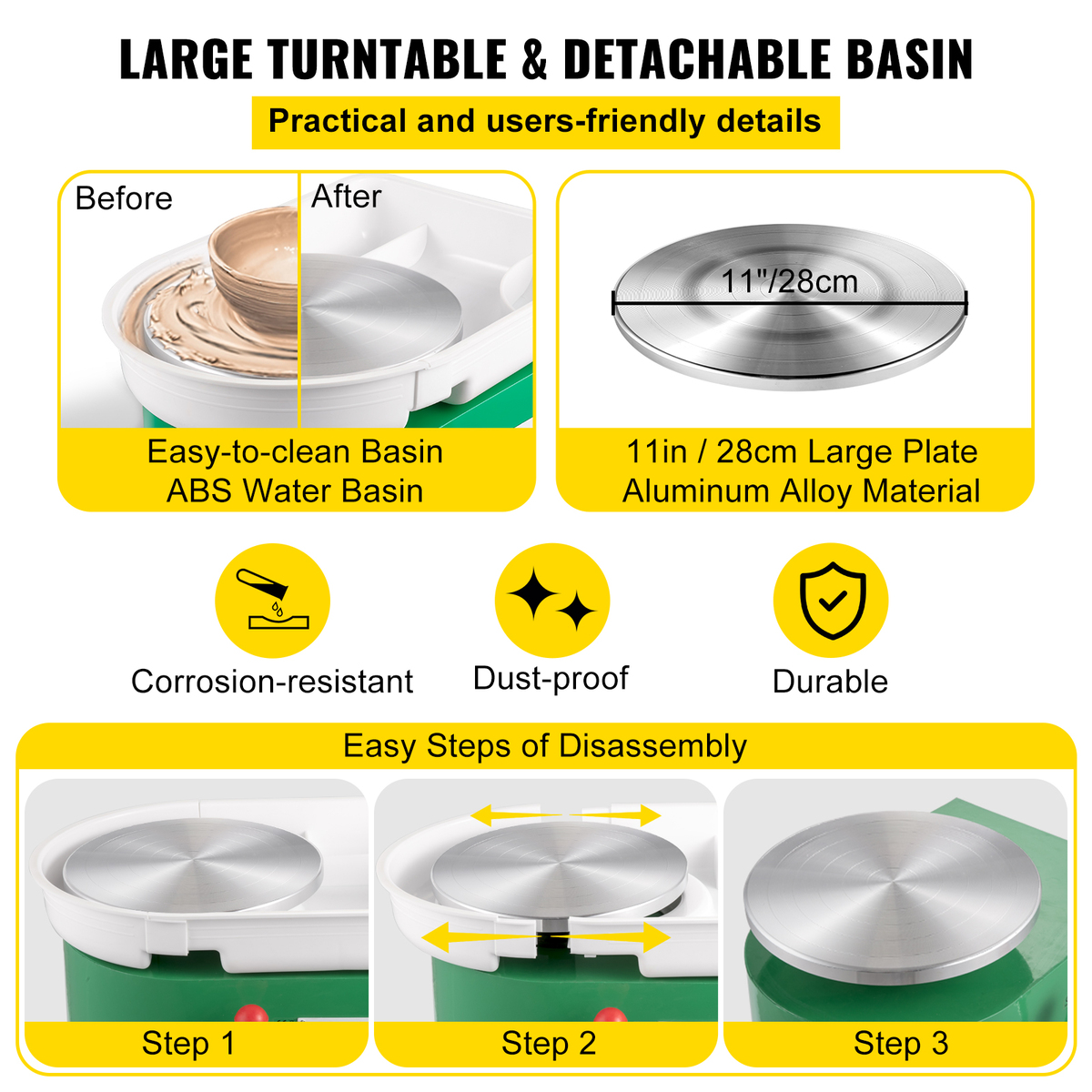 11" Aluminum Alloy Wheel: 11" / 28 cm large aluminum alloy turntable allows users to draw large pieces quickly. Besides, an enclosed water basin prevents mud from eroding and penetrating the fuselage. Moreover, it is detachable for easy cleaning.