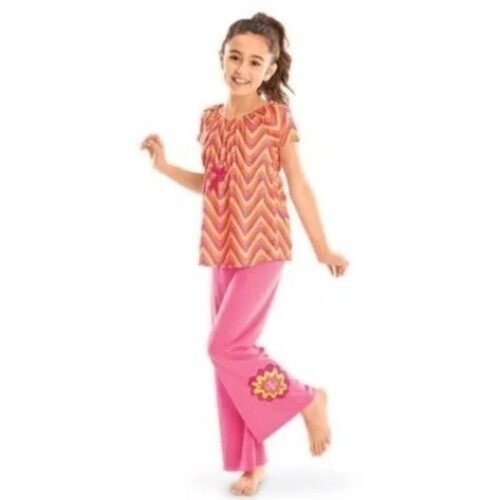 This vibrant pajama set features a colorful zigzag top and coordinating pink pants. Designed for comfort and style during sleep or lounging.