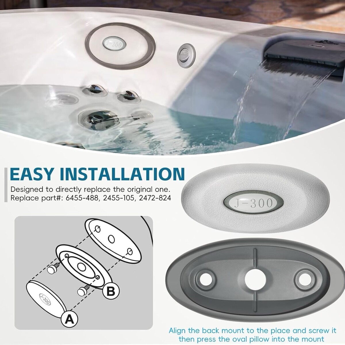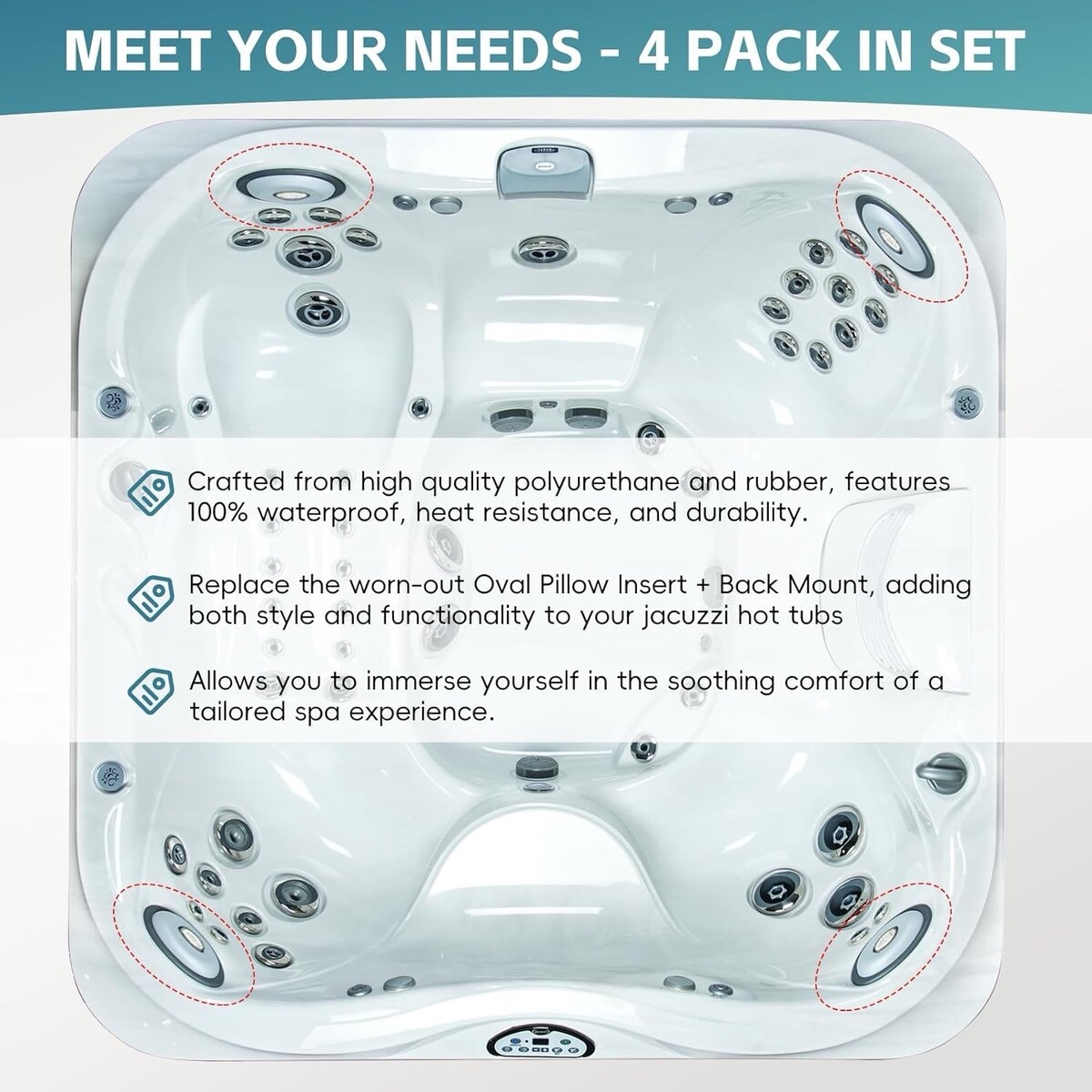 4-pack replacement headrest pillow set for Jacuzzi J-300 Series hot tubs (2004?2018). These high-quality oval pillow inserts include the required back mount plates, making them a complete drop-in replacement for worn or missing originals.