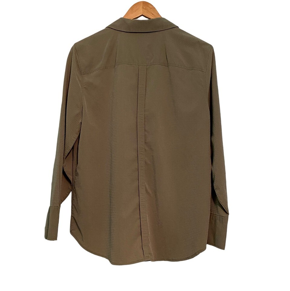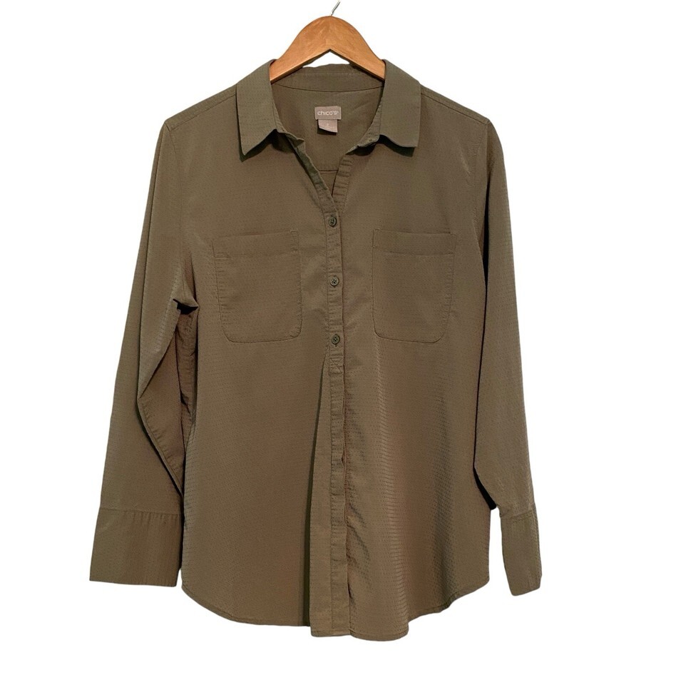 Chicos Long Sleeve Shirt Hidden Button Up Blouse Size 2 Olive Green Textured