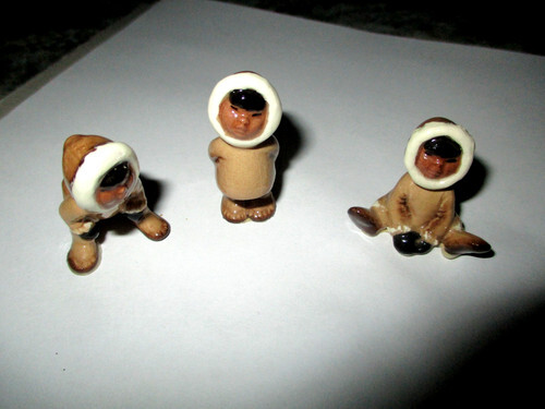 Cute ceramic Eskimo figurines. Holly leaves and berries on their hoods.