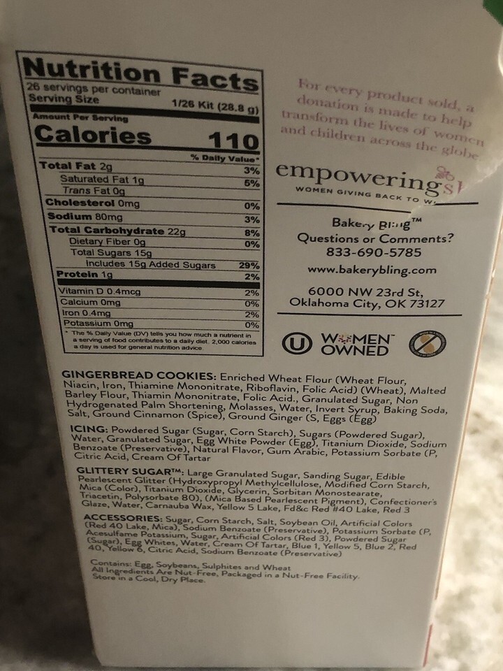 Gingerbread Cookie: Enriched Wheat Flour (wheat Flour, Niacin, Iron, Thiamine Mononitrate, Riboflavin, Folic Acid) (wheat), Malted Barley Flour, Thiamin Mononitrate, Folic Acid., Granulated Sugar, Non-hydrogenated Palm Shortening, Molasses, Water, Invert Syrup, Baking Soda, Salt, Ground Cinnamon (spice), Ground Ginger (s, Eggs (egg) Icing: Powdered Sugar (sugar, Corn Starch), Sugars (powdered Sugar), Water, Granulated Sugar, Egg White Powder (egg), Titanium Dioxide, Sodium Benzoate (preservative), Natural Flavor, Gum Arabic, Potassium Sorbate (p, Citric Acid, Cream Of Tartar Glittery Sugartm: Large Granulated Sugar, Sanding Sugar, Edible Pearlescent Glitter (hydroxypropyl Methylcellulose, Modified Corn Starch, Mica (color) Titanium Dioxide, Glycerin, Sorbitan Monostearate, Triacetin, Polysorbate 80), (mica Based Pearlescent Pigment), Confectioner's Glaze, Water, Fd c Red #40 Lake, Red 3, Carnauba Wax Accessories: Red Pearls: Sugar, Corn Starch, Salt, Soybean Oil, Artificial Colors (red 40 Lake, Mica), Sodium Benzoate (preservative), Potassium Sorbate (p, Acesulfame Potassium., Pink Pearls: Sugar, Artificial Colors (red 3), Sugar, Dextrose, Vegetable (palm And/or Palm Kernal), Rice Flour, Corn Syrup, Dextrin, Soy Lecithin, Confectioner's Glaze, Gum Arabic, Carnauba Wax, Cellulose Gum, Carrageenan, Natural And Artificial Flavors, Red 40, Yellow 5, Blue 1. (soy)
