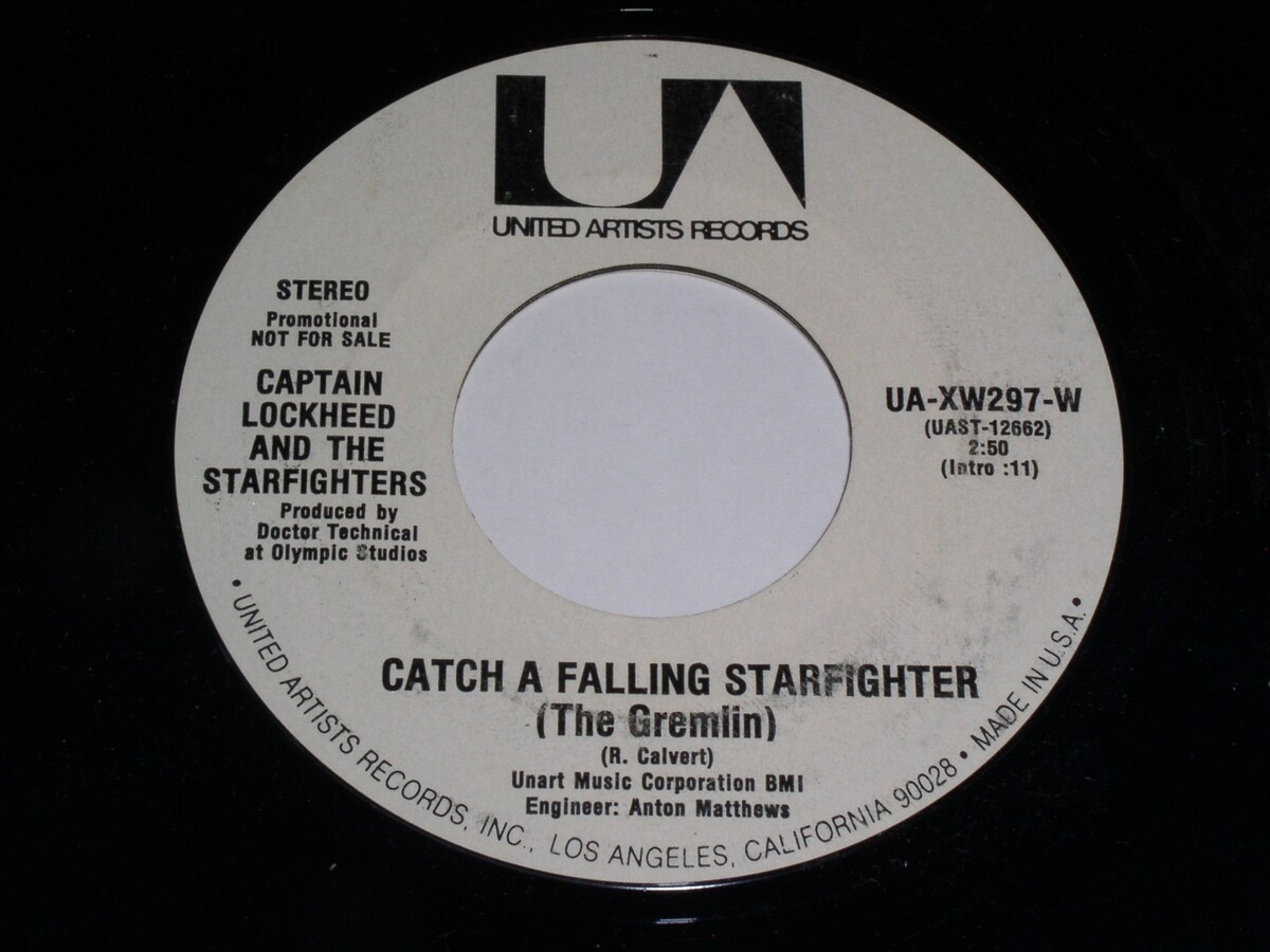 This is a vintage 45 rpm phonograph record release by Captain Lockheed and the Starfighters entitled, "Ejection". Flipside: "Catch A Falling Starfighter (The Gremlin)". Record label: United Artists UA-XW297-W.