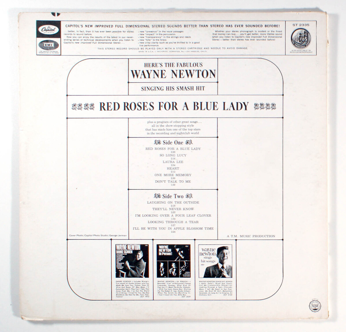 Red Roses For A Blue Lady, by Wayne Newton, is a 1965 studio album by American singer Wayne Newton, released on Capitol Records, showcasing his smooth baritone voice in a collection of sentimental pop and easy-listening ballads. The 11-track record features covers of romantic standards, including upbeat numbers like I'm Looking Over a Four Leaf Clover and heartfelt tunes such as Laughing on the Outside (Crying on the Inside), highlighting Newton's transition from teen idol to versatile entertainer. Historically significant as one of Newton's early charting albums during his rise to fame in Las Vegas, it capitalized on the mid-1960s revival of 1940s pop songs amid the British Invasion. The title track, a cover of the 1948 hit originally popularized by Vaughn Monroe, became a standout revival in 1965 with three versions charting simultaneously by Newton, Vic Dana, and Bert Kaempfert. The hit single Red Roses for a Blue Lady peaked at No. 23 on the Billboard Hot 100 and No. 4 on the Easy Listening chart, solidifying Newton's appeal in adult contemporary music and remaining a staple in his live performances.
