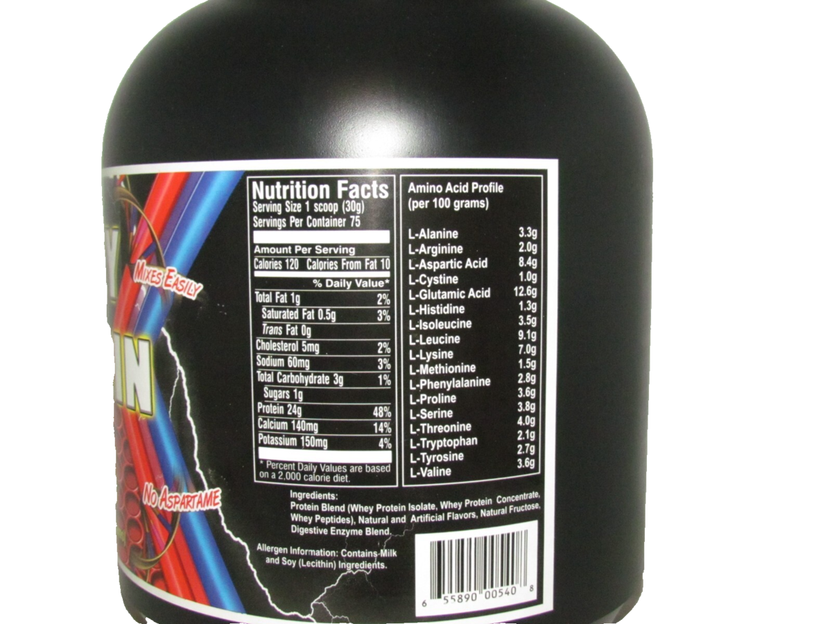 Serving Size 1 scoop (30g) - Servings Per Container 75 Calories per serving 120 Calories from Fat 10 Total Fat 1g -Saturated fat 0.5g - Trans Fat 0g - Cholesterol 5mg - Sodium 60g Total Carbs 3g Sugars 1g Protein 24g Calcium 140mg Potassium 150mg Amino Acid profile (per 100 grams) L-Alanine 3.3g L-Arginine 2.0g L-Aspartic Acid 8.4g L-Cystine 1.0g L-Glutamic Acid 12.6g L-Histidine 1.3g L-Isoleucine 3.5g L-Leucine 9.1g L-Lysine 7.0g L-Methionine 1.5g L-Phenylalanine 2.8g L-Proline 3.6g L-Serine 3.8g L-Threonine 4.0g L-Tryptophan 2.1g L-Tyrosine 2.7g L-Valine 3.6g Ingredients: Protein Blend (Whey Protein Isolate, Whey Protein Concentrate, Whey Peptides), Natural and Artificial Flavors, Natural Fructose, Digestive Enzyme Blend. Allergen Info: Contains Milk and Soy (Lecithin) Ingredients.