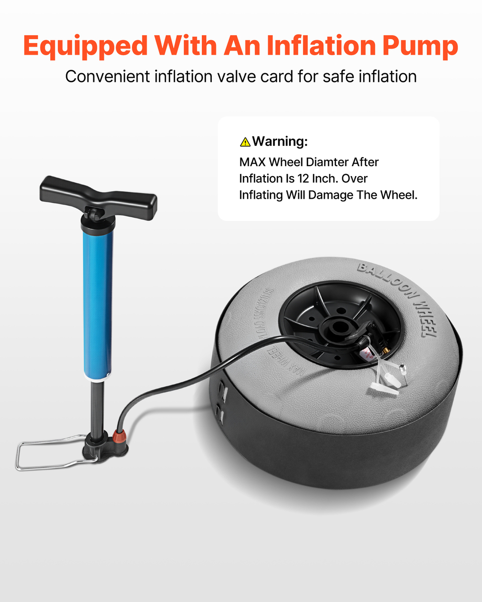 Beach-Specific Balloon Wheels: Our 9-inch balloon wheels are designed specifically for beach terrain. They smoothly navigate sand, mud, grass, and rough terrain without sinking. Equipped with an air pump and inflation valve, they are safely inflated for soft, highly elastic, and durable performance.