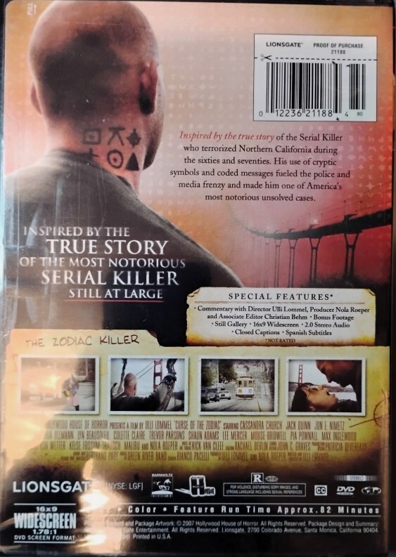 Description of item: Every murder is another sign. Inspired by the true story of the notorious Zodiac Killer who terrorized Northern California in the 1960s and 70s, Curse of the Zodiac follows the twisted mind of a murderer who used cryptic symbols, coded messages, and gruesome killings to spread fear across an entire state. From director Ulli Lommel (The Boogeyman), this chilling film explores the psychological darkness behind one of America?s most infamous unsolved cases. Featuring bonus footage, commentary, and widescreen presentation, this is a must-have for fans of true crime and psychological horror.